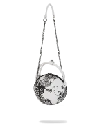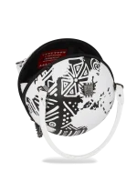 Whimsical sphere-shaped shoulder bag features map printed in saffiano fabric with contrast cognac pebble fabric