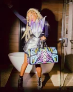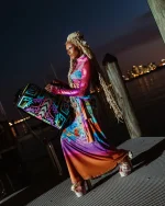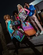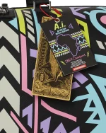 100% PVC brightly colored abstract design that glows in the dark featuring gunmetal hardware