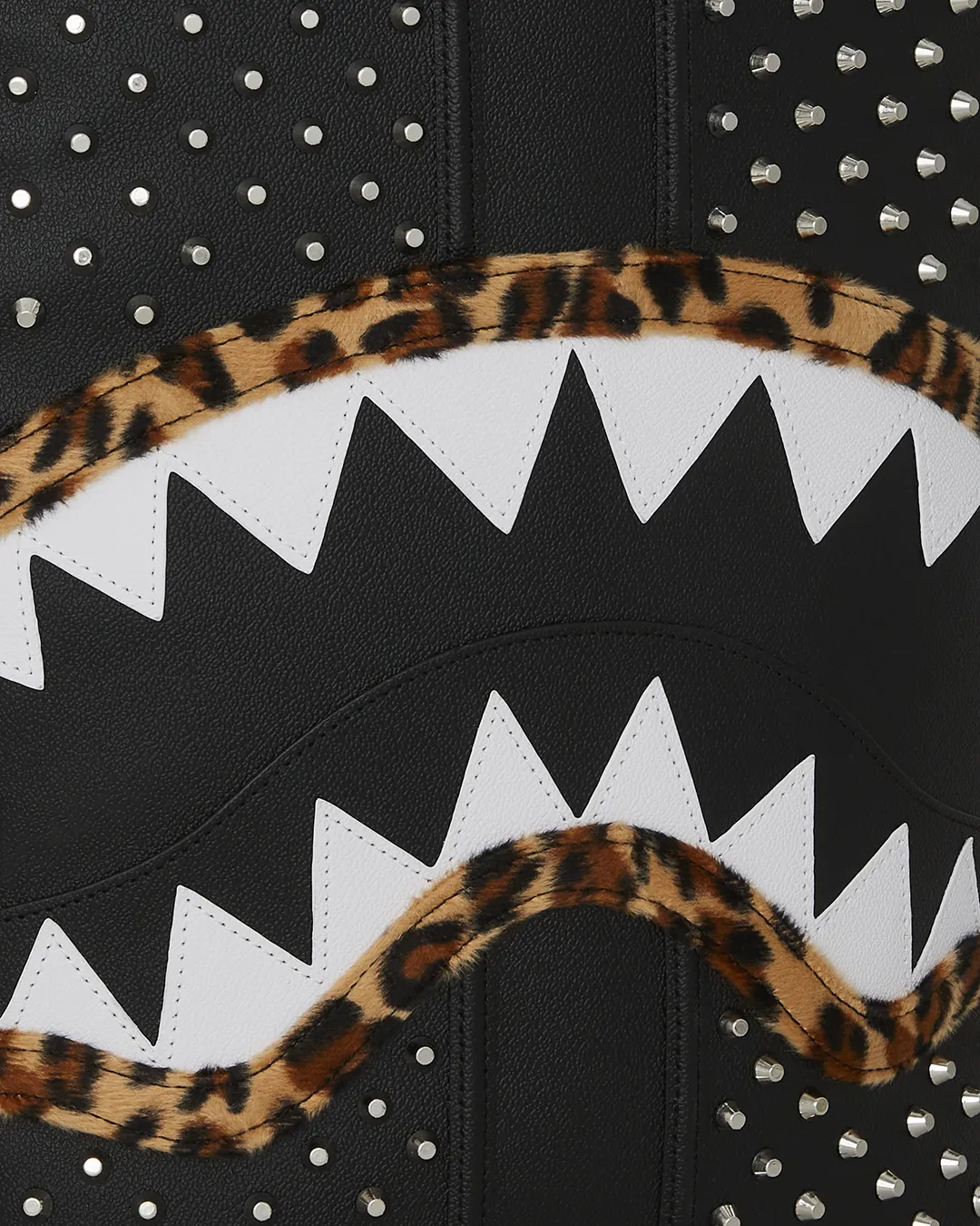 Texturized PVC leather with faux fur, cut and sew, and stud detailing