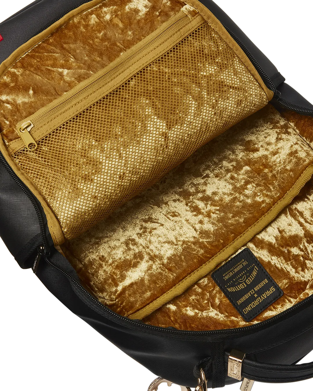 Dimensions: 18″ x 6″ x 11.5″ ? Front zipper pocket ? Side pockets ? Zippered Stash pocket ? Separate velour sunglass compartment ? Ergonomic mesh back padding ? Adjustable Straps for custom sizing ? Gold zippers with metal hardware ? Metal “Sprayground Authentic” badge ? Slide through back sleeve connects to carry-on luggage to free your hands