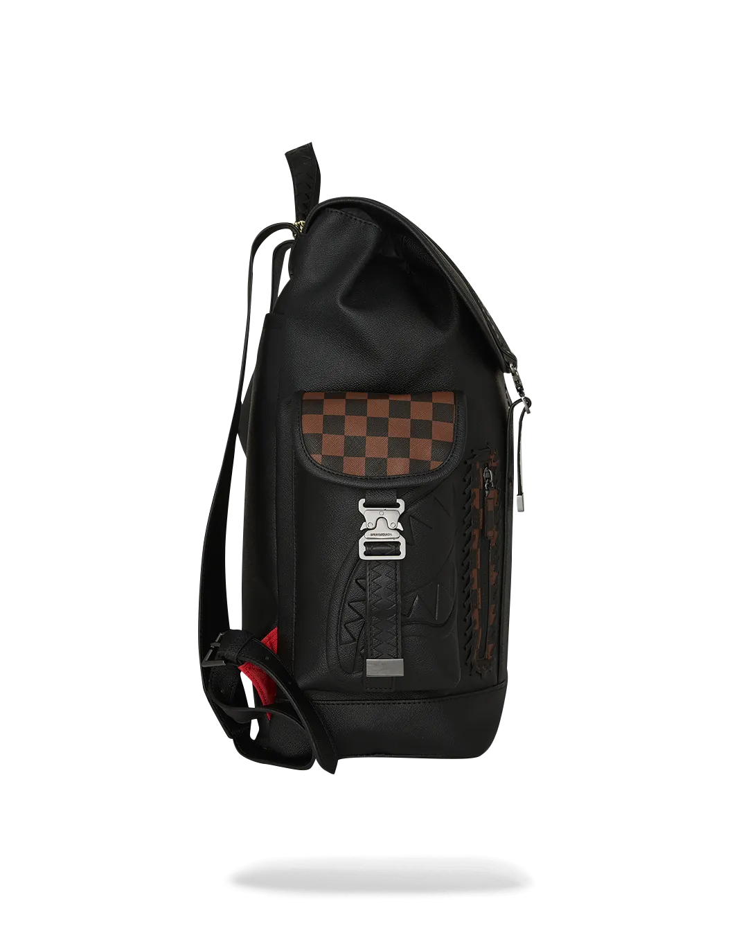 PVC bag with embossed details such as the sharkmouth and zipper pullers. Sewn faux leather details around the front zipper pocket.