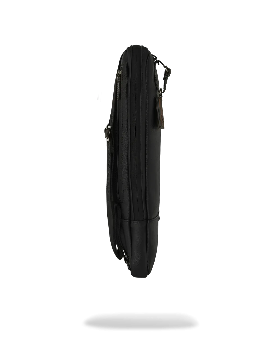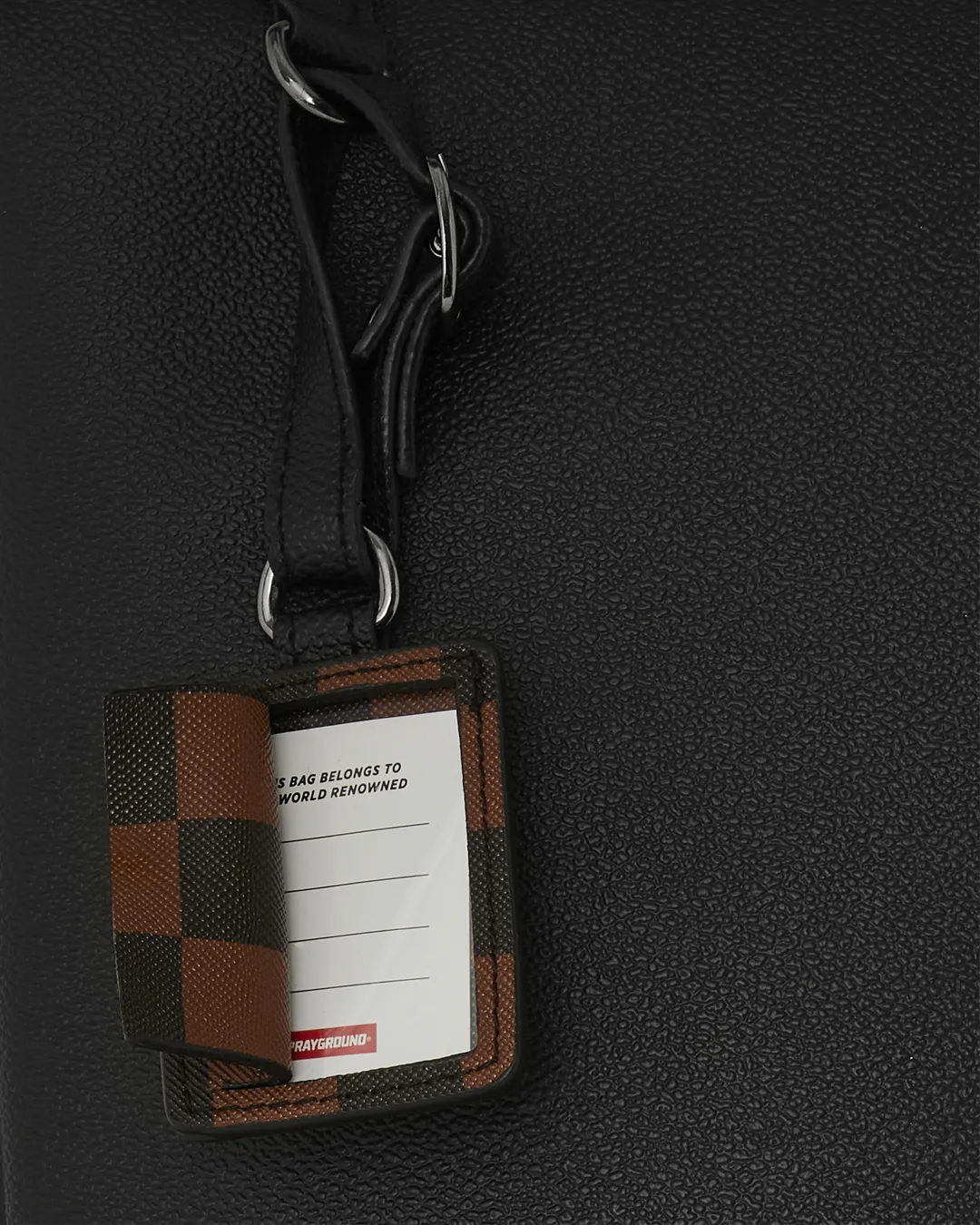 PVC bag with embossed details such as the sharkmouth, zipper pullers, and ID tag. Sewn faux leather details around the front zipper pocket and ID tag.