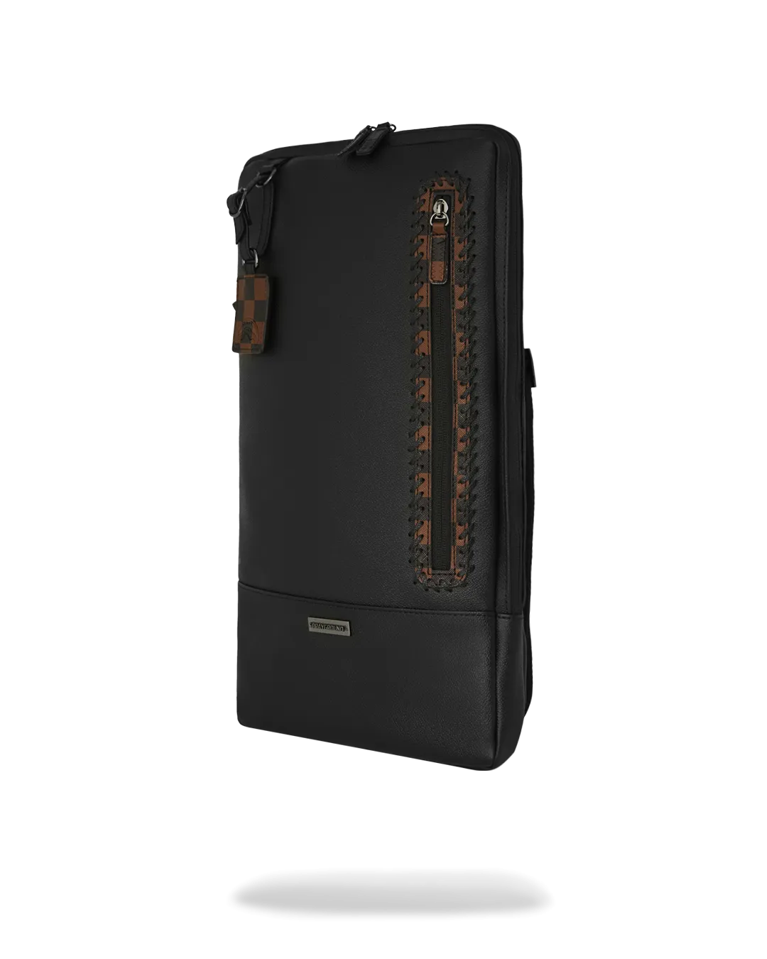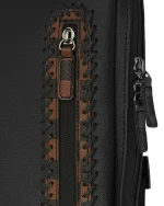Ergonomic mesh back padding, Whip stitch detailing, adjustable straps, 2 exterior pockets, features a whip stitch luggage tag, embossed zipper pulls