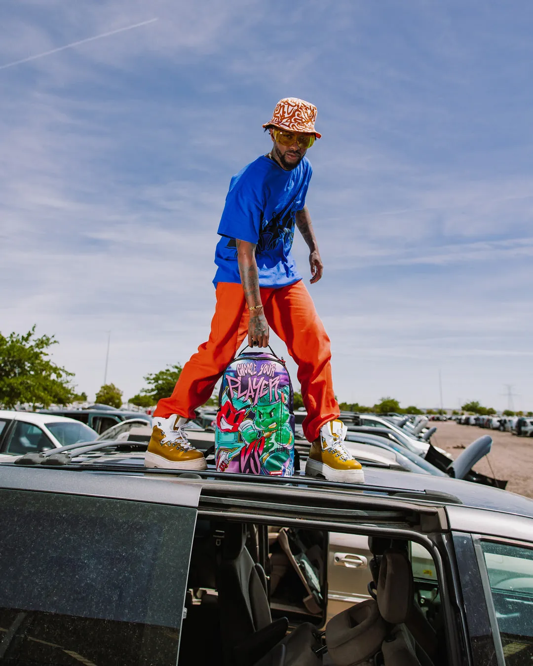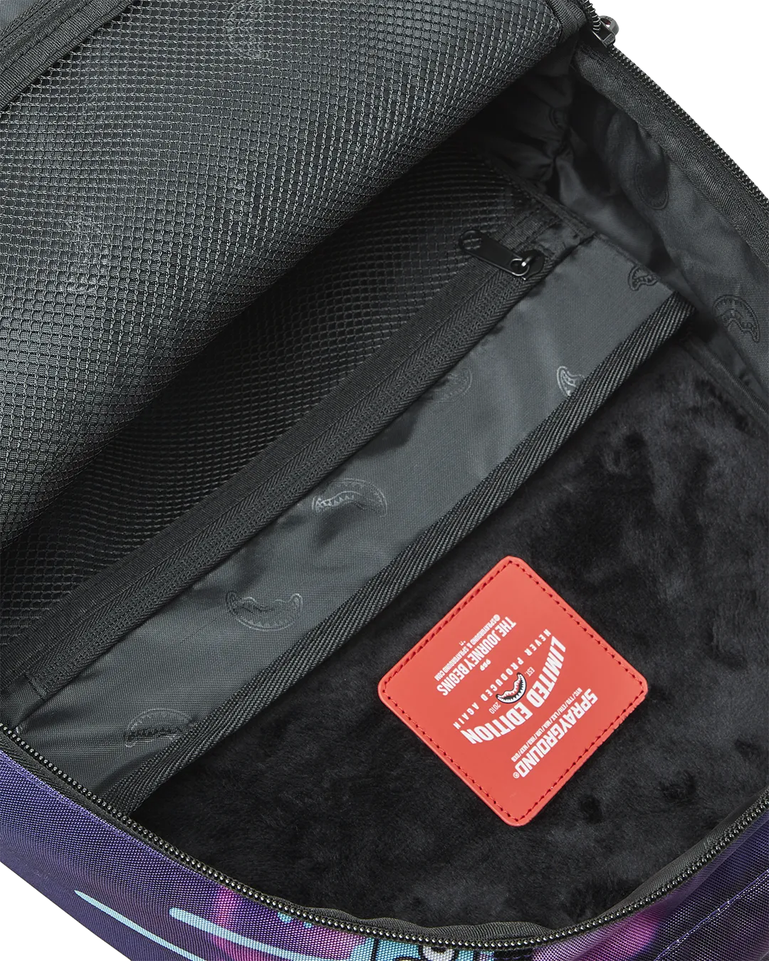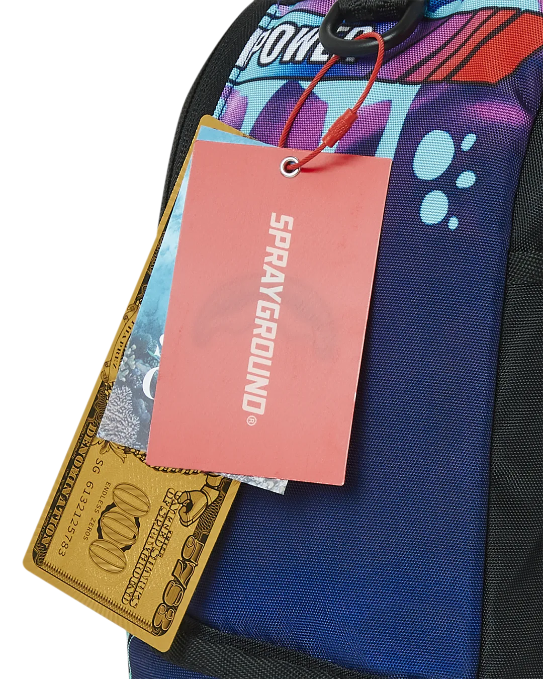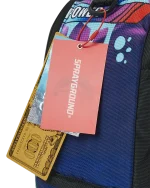 Dimensions: 18″ x 6″ x 11.5″ ? Front zipper pocket ? Side pockets ? Zippered Stash pocket ? Separate velour sunglass compartment ? Ergonomic mesh back padding ? Adjustable Straps for custom sizing ? Gold zippers with metal hardware ? Metal “Sprayground Authentic” badge ? Slide through back sleeve connects to carry-on luggage to free your hands