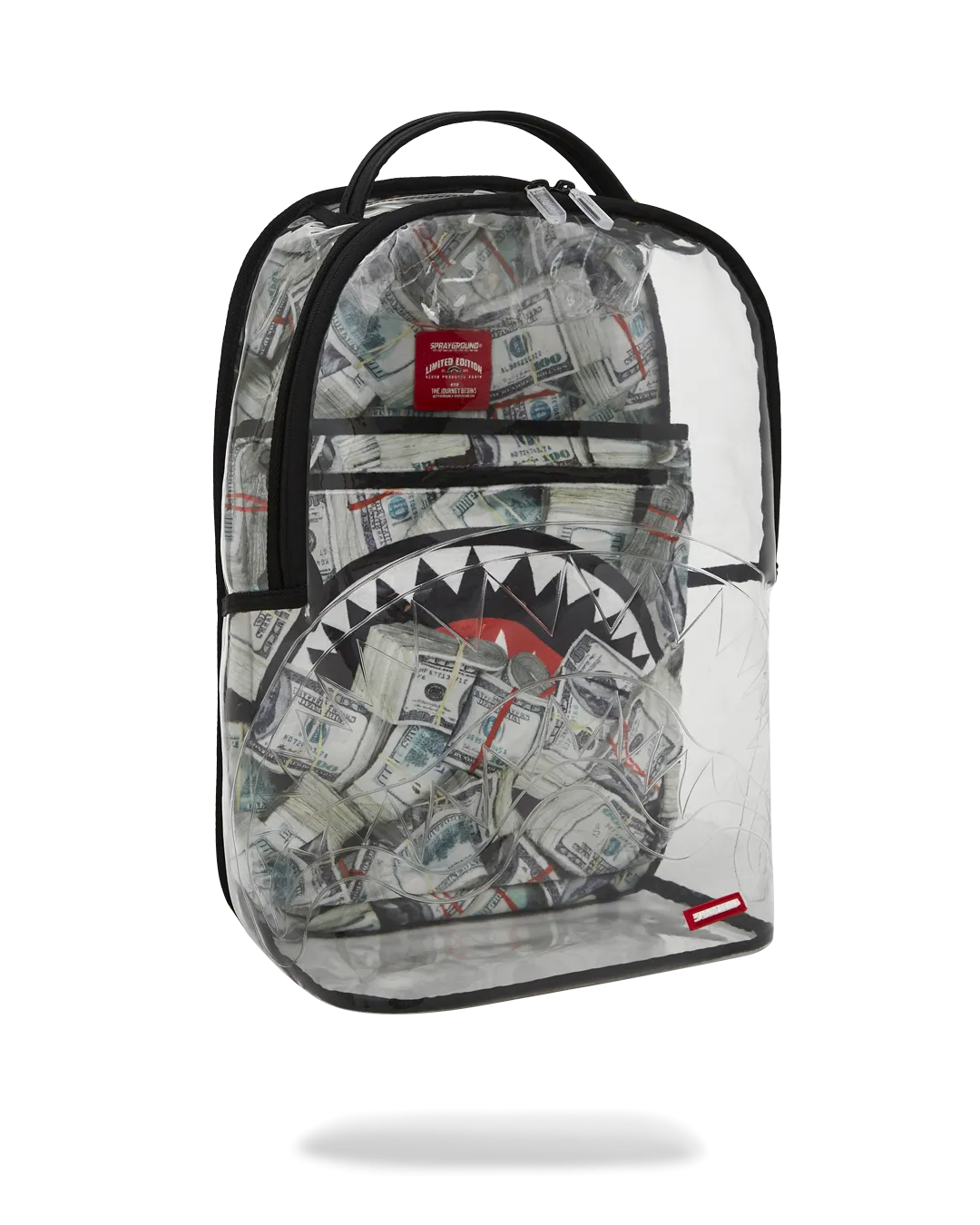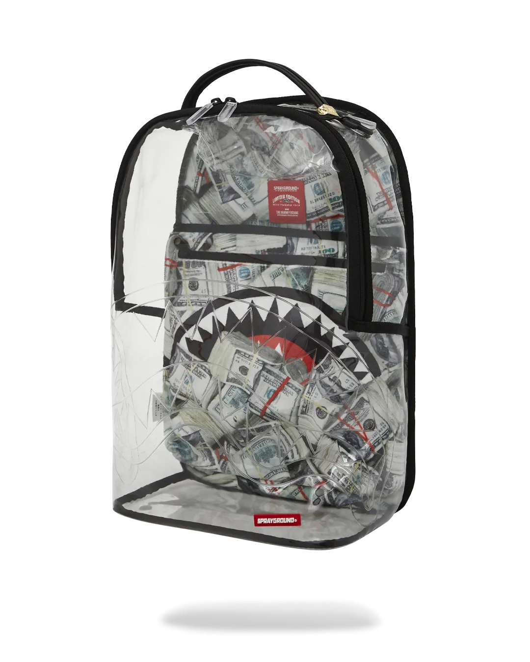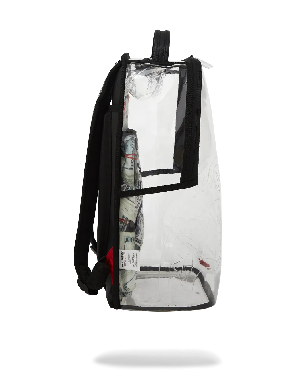 Clear PVC front, side, top, and bottom panels. Back panel features artwork of money.