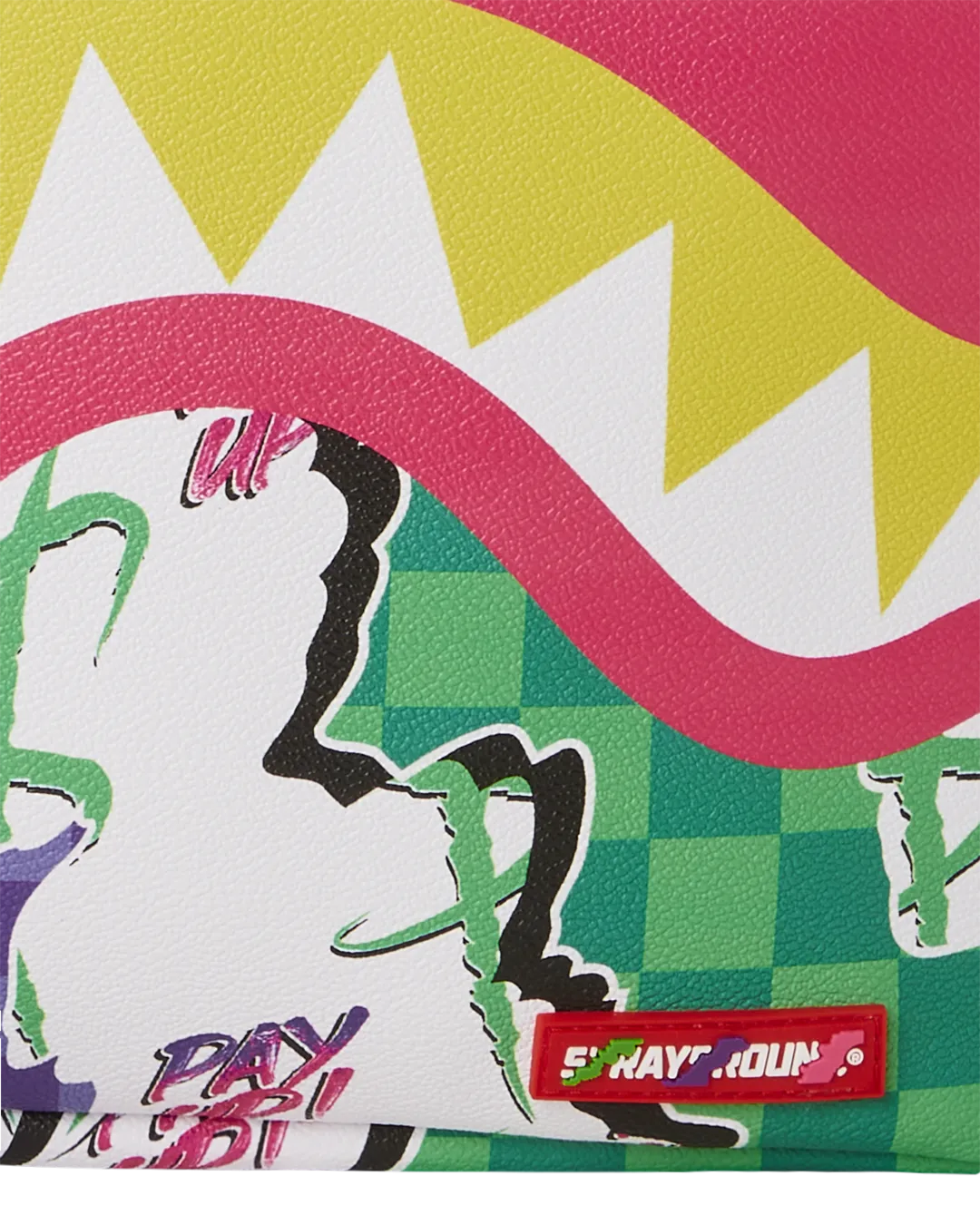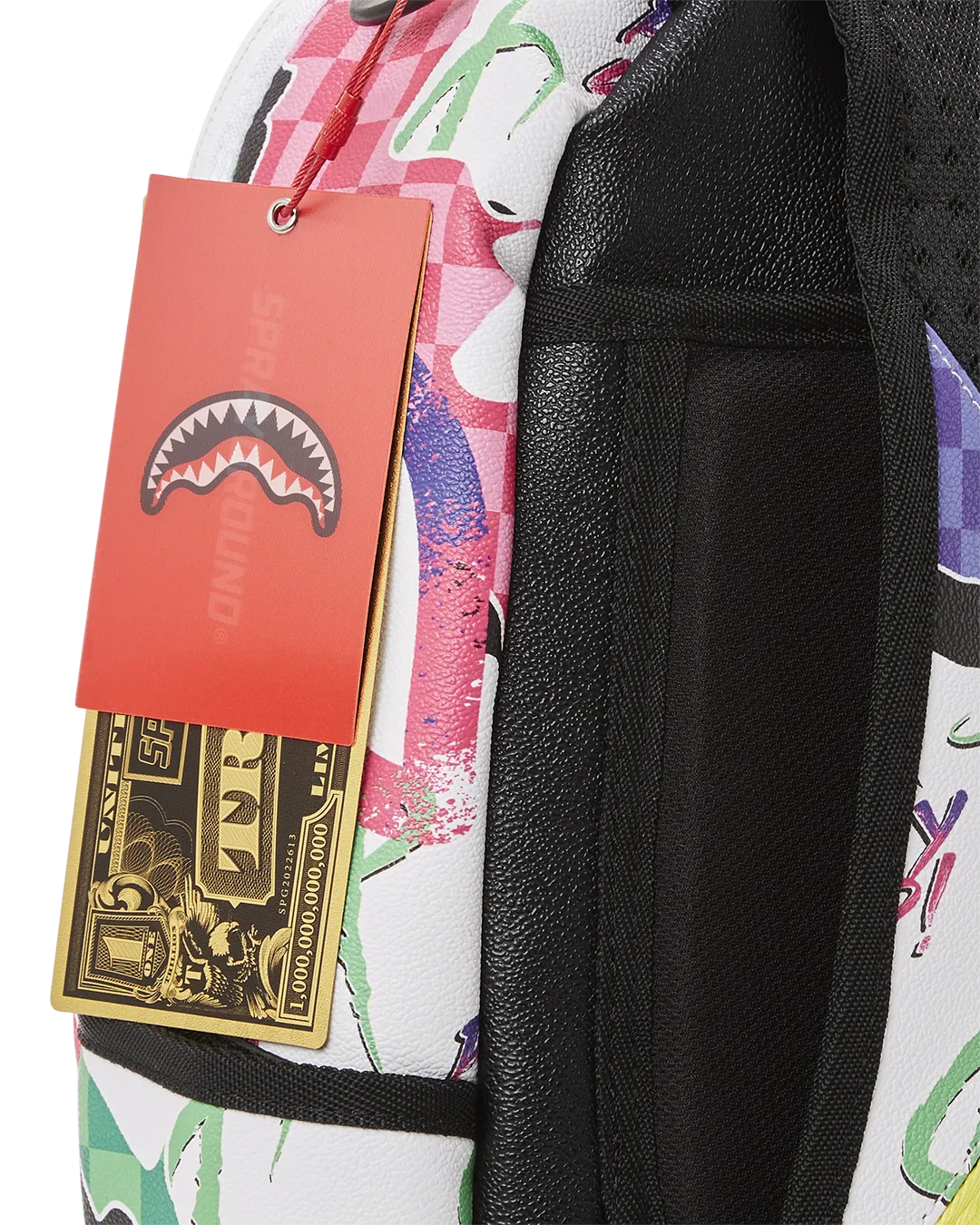 Dimensions: 18″ x 6″ x 11.5″ ? Front zipper pocket ? Side pockets ? Zippered Stash pocket ? Separate velour sunglass compartment ? Ergonomic mesh back padding ? Adjustable Straps for custom sizing ? Gold zippers with metal hardware ? Metal “Sprayground Authentic” badge ? Slide through back sleeve connects to carry-on luggage to free your hands