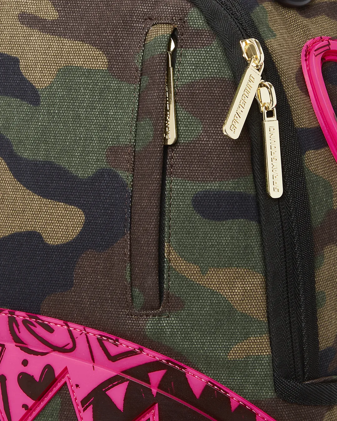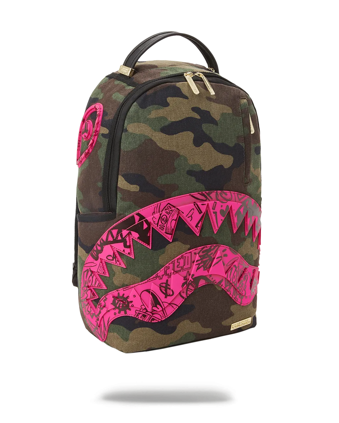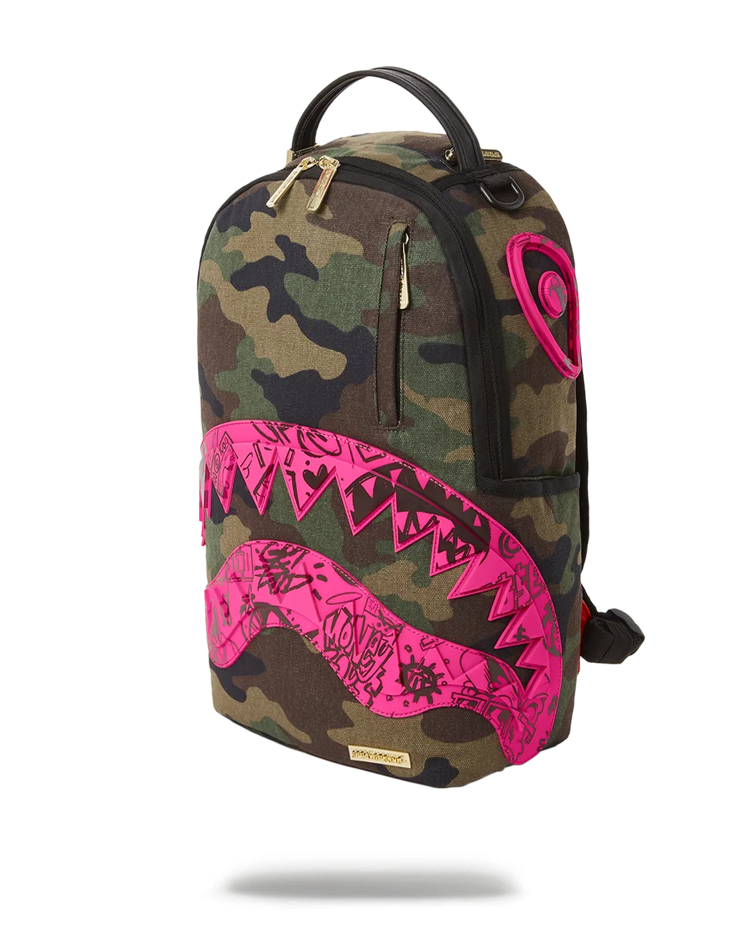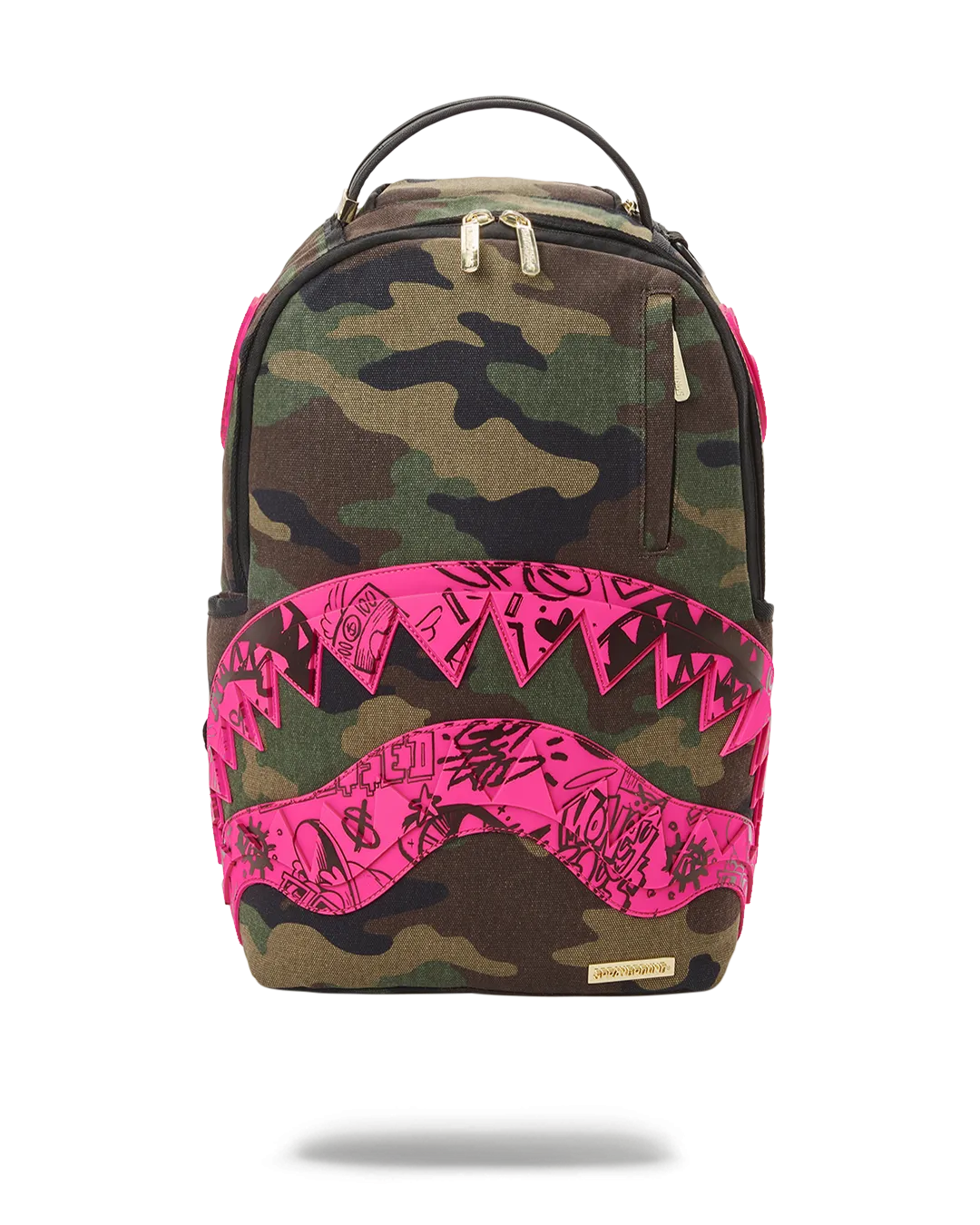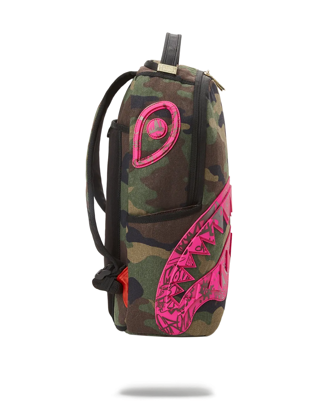 Dimensions: 18″ x 6″ x 11.5″ ? Rubber Shark Mouth Front zipper pocket ? Side pockets ? Zippered Stash pocket ? Separate velour sunglass compartment ? Ergonomic mesh back padding ? Adjustable Straps for custom sizing ? Gold zippers with metal hardware ? Metal “Sprayground Authentic” badge ? Slide through back sleeve connects to carry-on luggage to free your hands