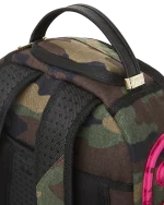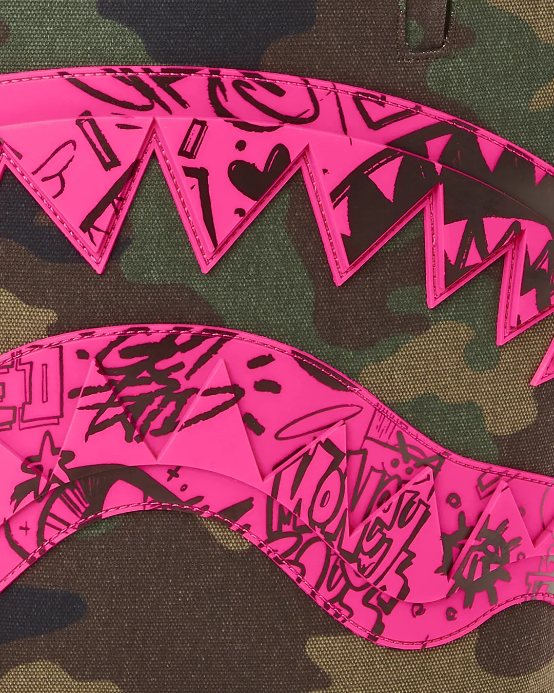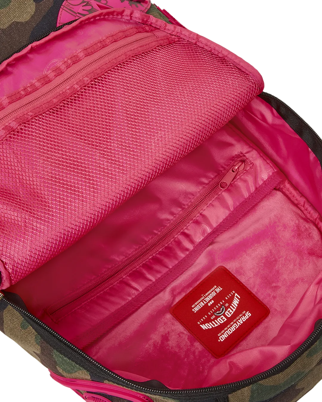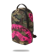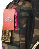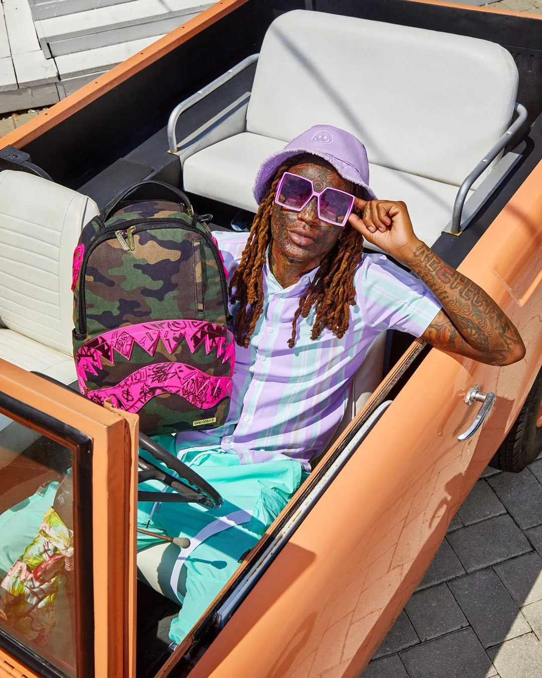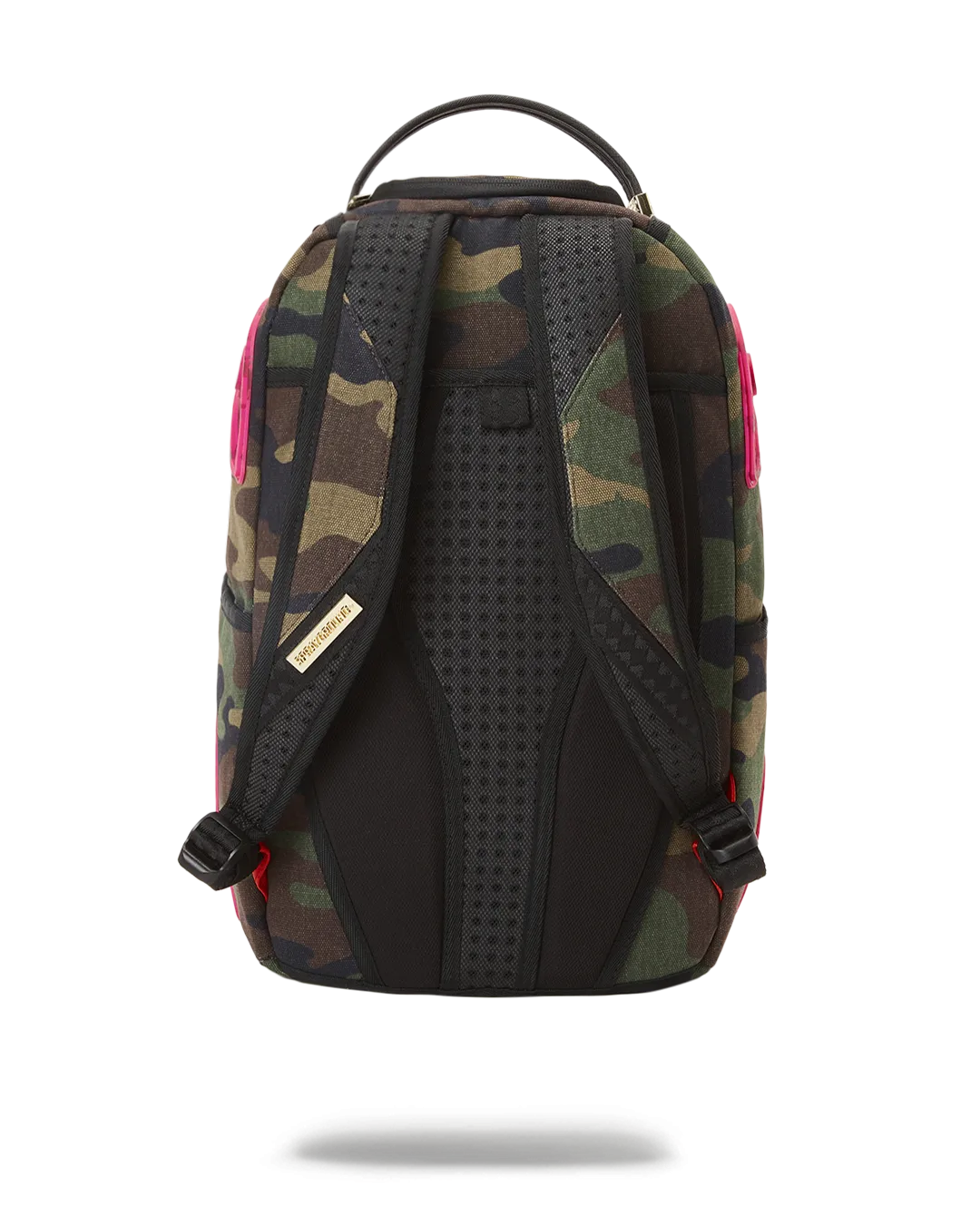 Dimensions: 18″ x 6″ x 11.5″ ? Rubber Shark Mouth Front zipper pocket ? Side pockets ? Zippered Stash pocket ? Separate velour sunglass compartment ? Ergonomic mesh back padding ? Adjustable Straps for custom sizing ? Gold zippers with metal hardware ? Metal “Sprayground Authentic” badge ? Slide through back sleeve connects to carry-on luggage to free your hands