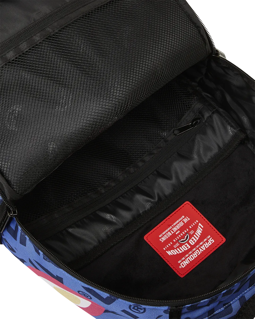 Dimensions: 18″ x 6″ x 11.5″ ? Front zipper pocket ? Side pockets ? Zippered Stash pocket ? Separate velour sunglass compartment ? Ergonomic mesh back padding ? Adjustable Straps for custom sizing ? Gold zippers with metal hardware ? Metal “Sprayground Authentic” badge ? Slide through back sleeve connects to carry-on luggage to free your hands