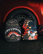 Dimensions: 18″ x 6″ x 11.5″ ? Front zipper pocket ? Side pockets ? Zippered Stash pocket ? Separate velour sunglass compartment ? Ergonomic mesh back padding ? Adjustable Straps for custom sizing ? Gold zippers with metal hardware ? Metal “Sprayground Authentic” badge ? Slide through back sleeve connects to carry-on luggage to free your hands