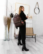 Dimensions: 10″ x 5″ x 11.5″ ? Two large main zippered compartments ? Side pockets ? Zippered Stash pocket ? Adjustable straps for custom sizing ? Gold zippers with metal hardware