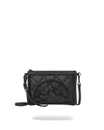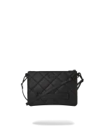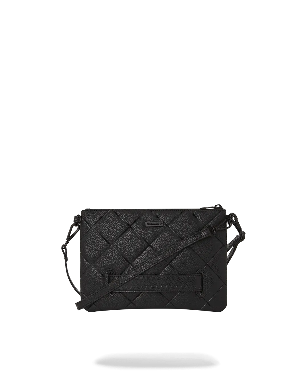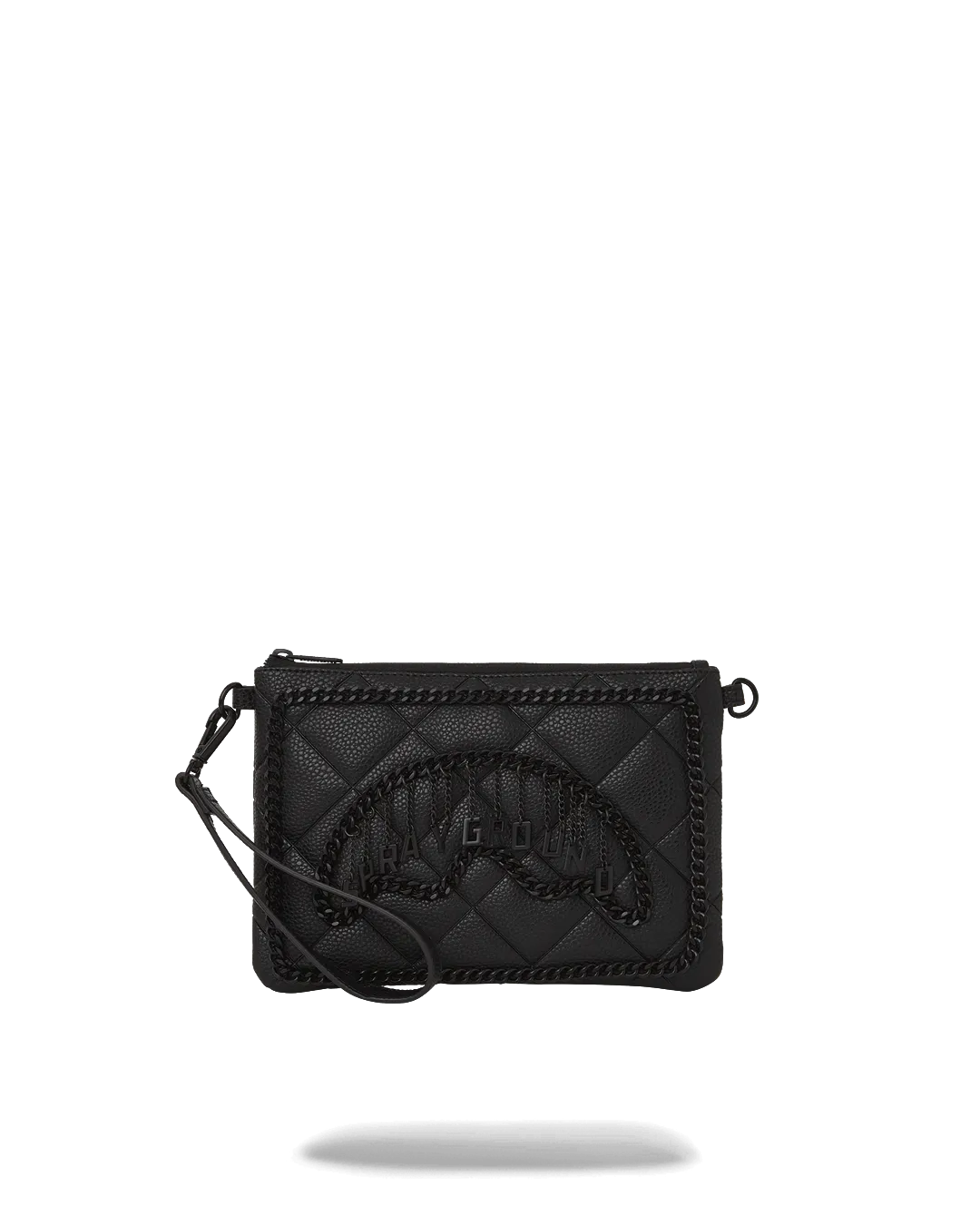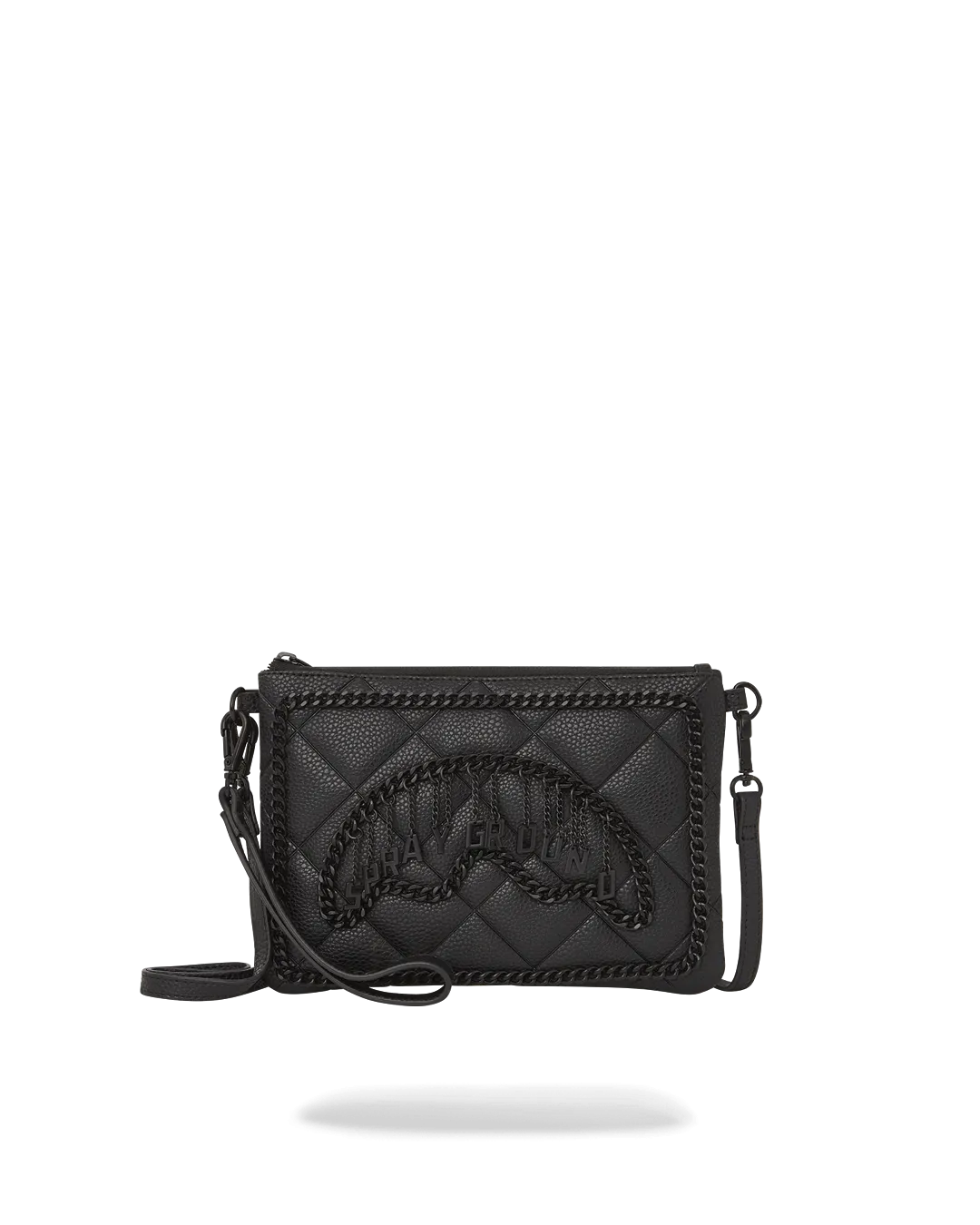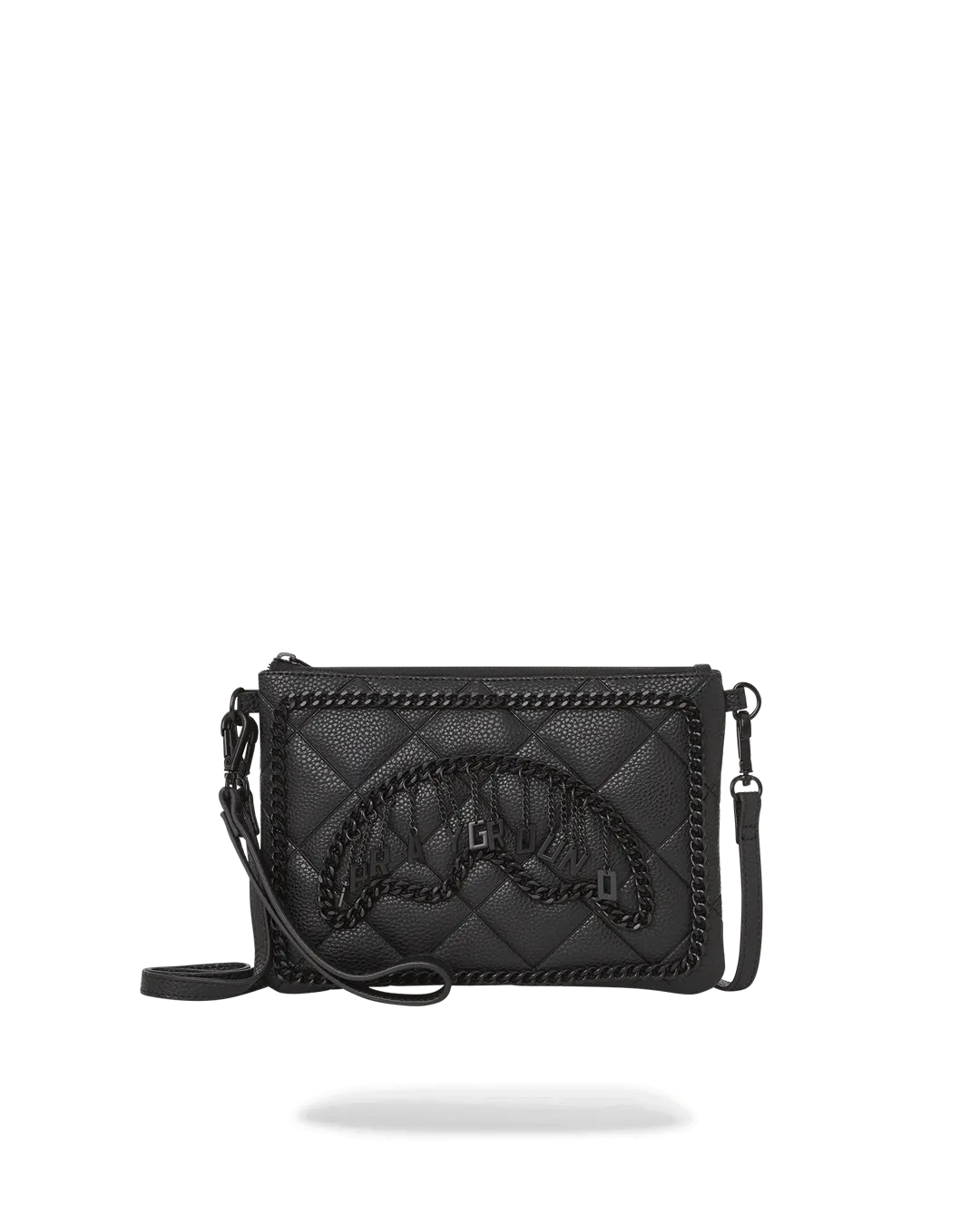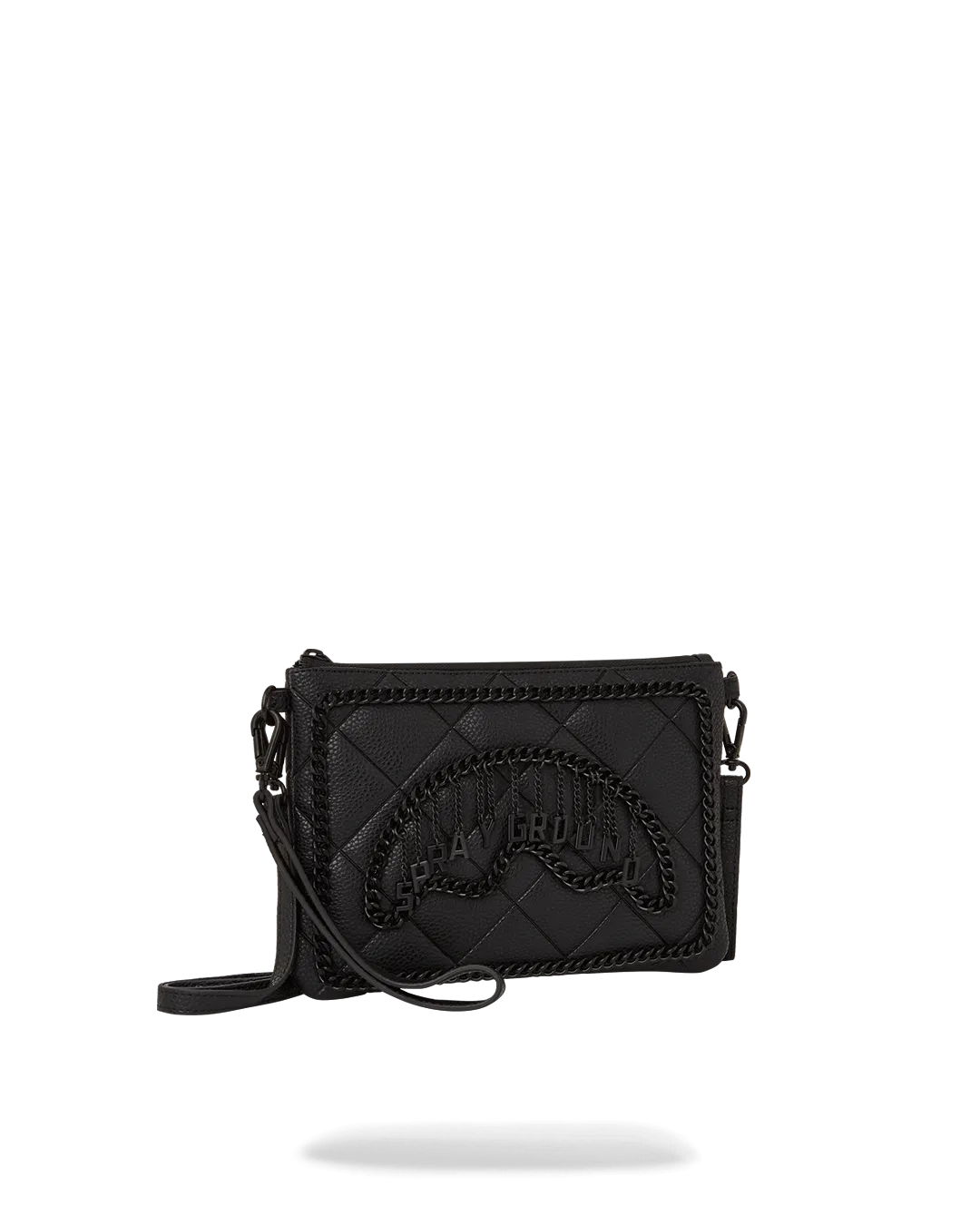 100% PVC quilted black faux leather featuring black chain hardware and hanging charm logo.