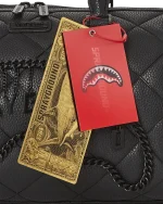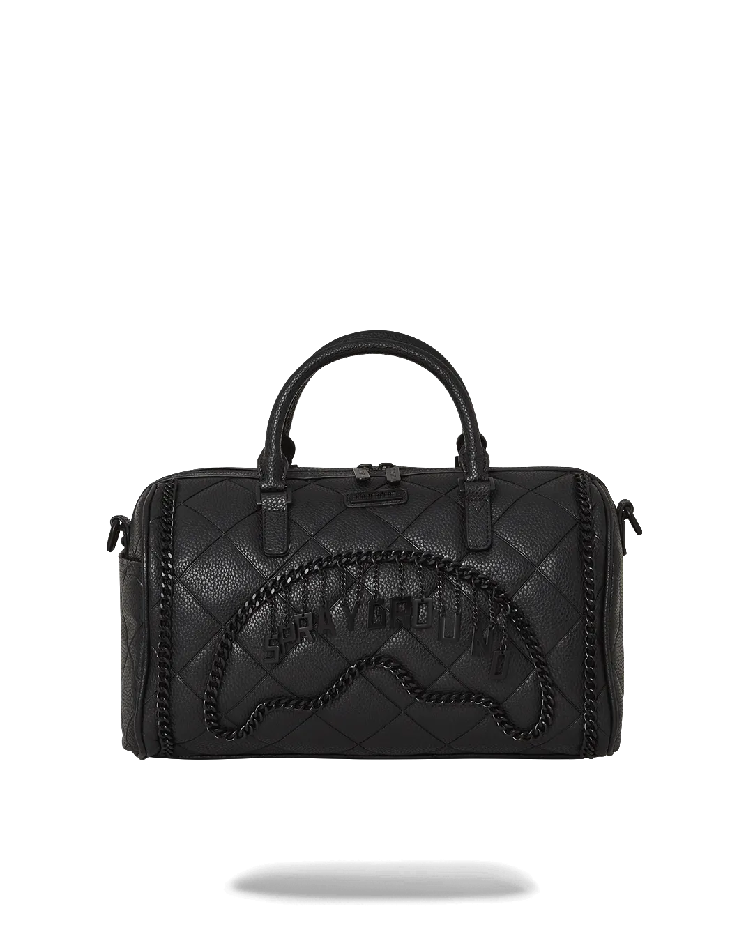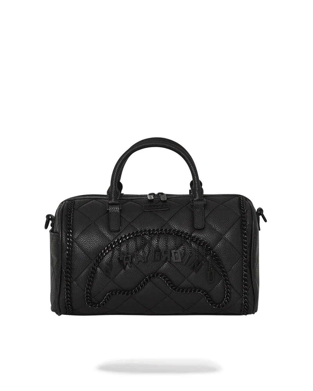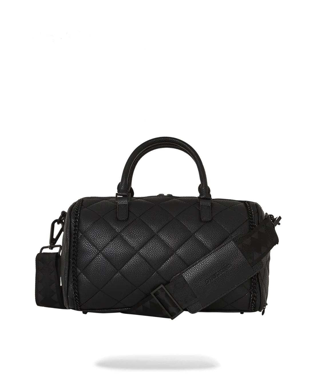 100% PVC quilted black faux leather featuring black chain hardware and hanging charm logo.