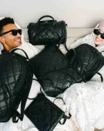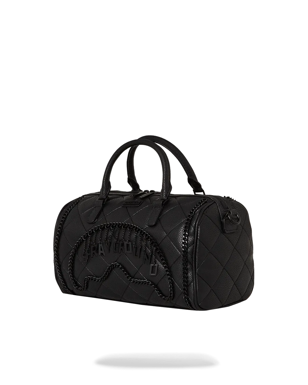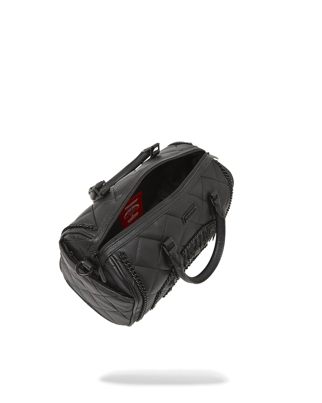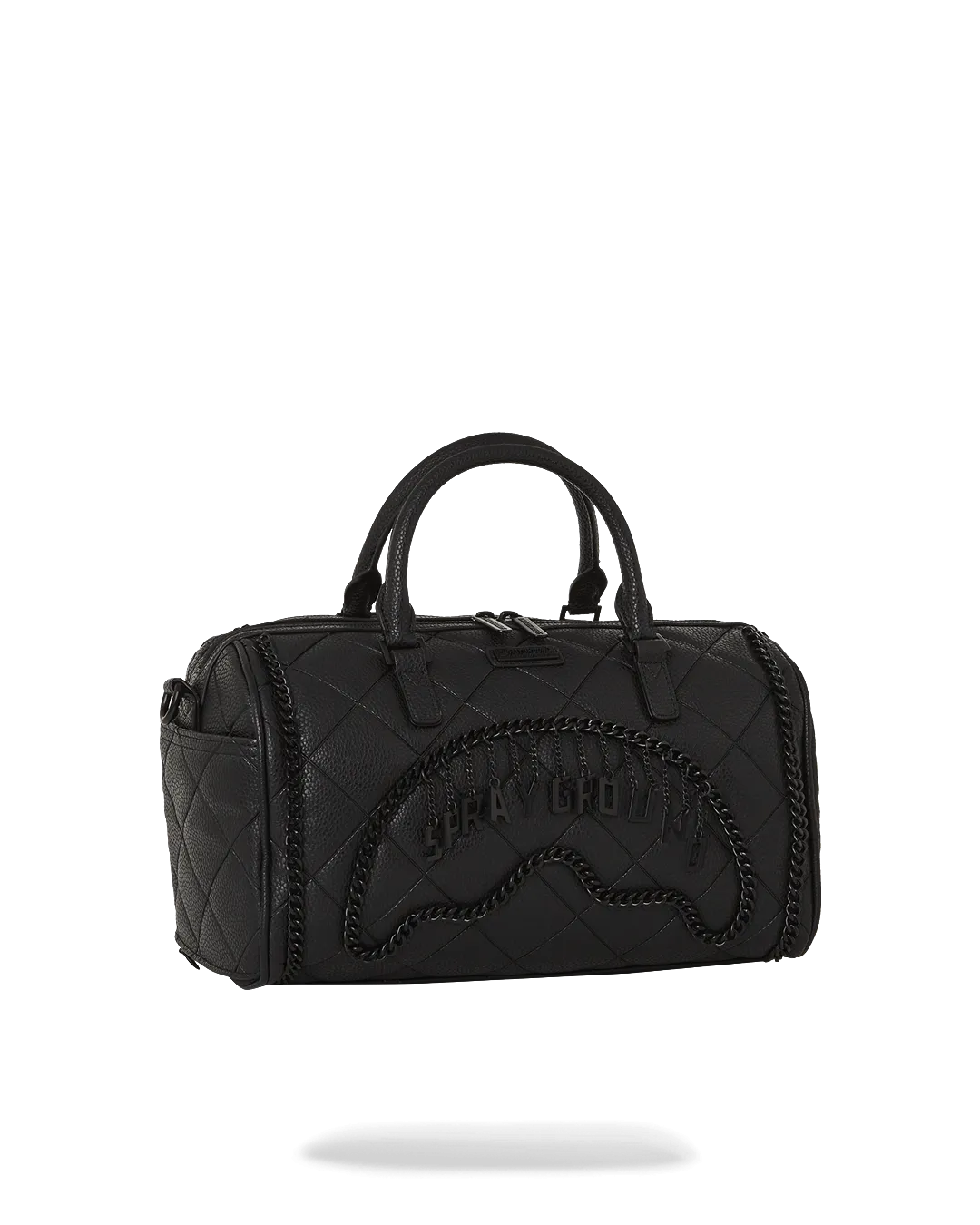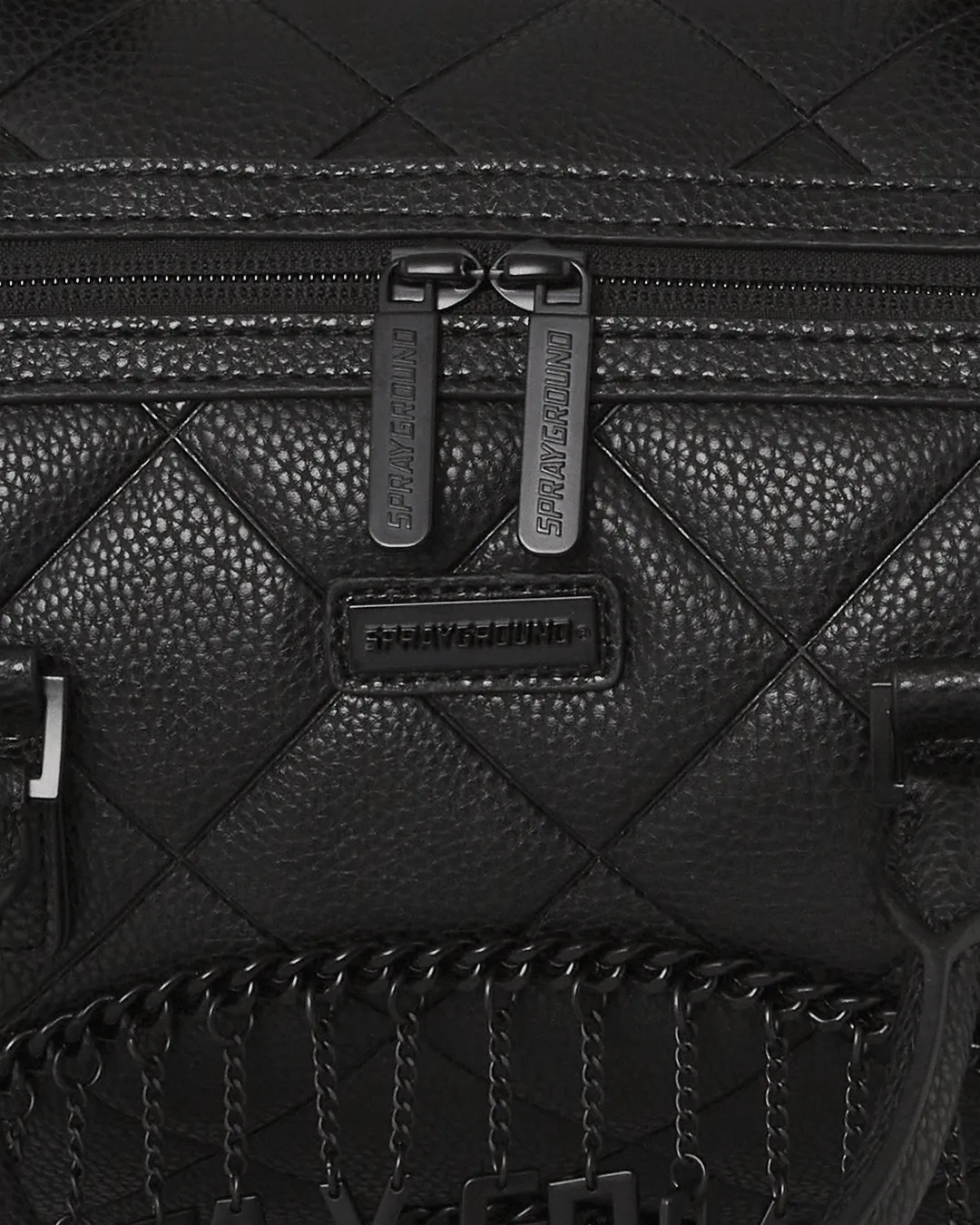 100% PVC quilted black faux leather featuring black chain hardware and hanging charm logo.