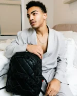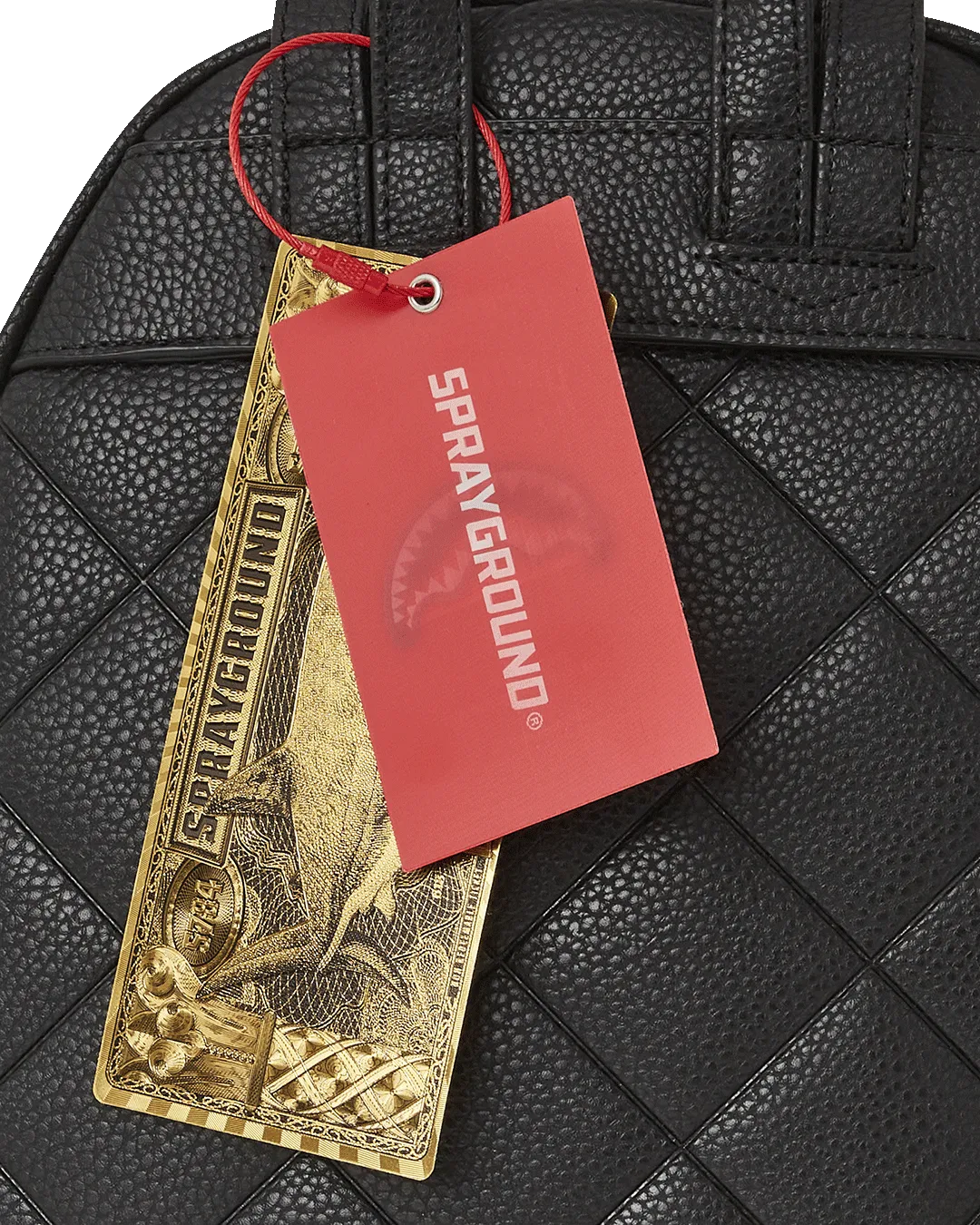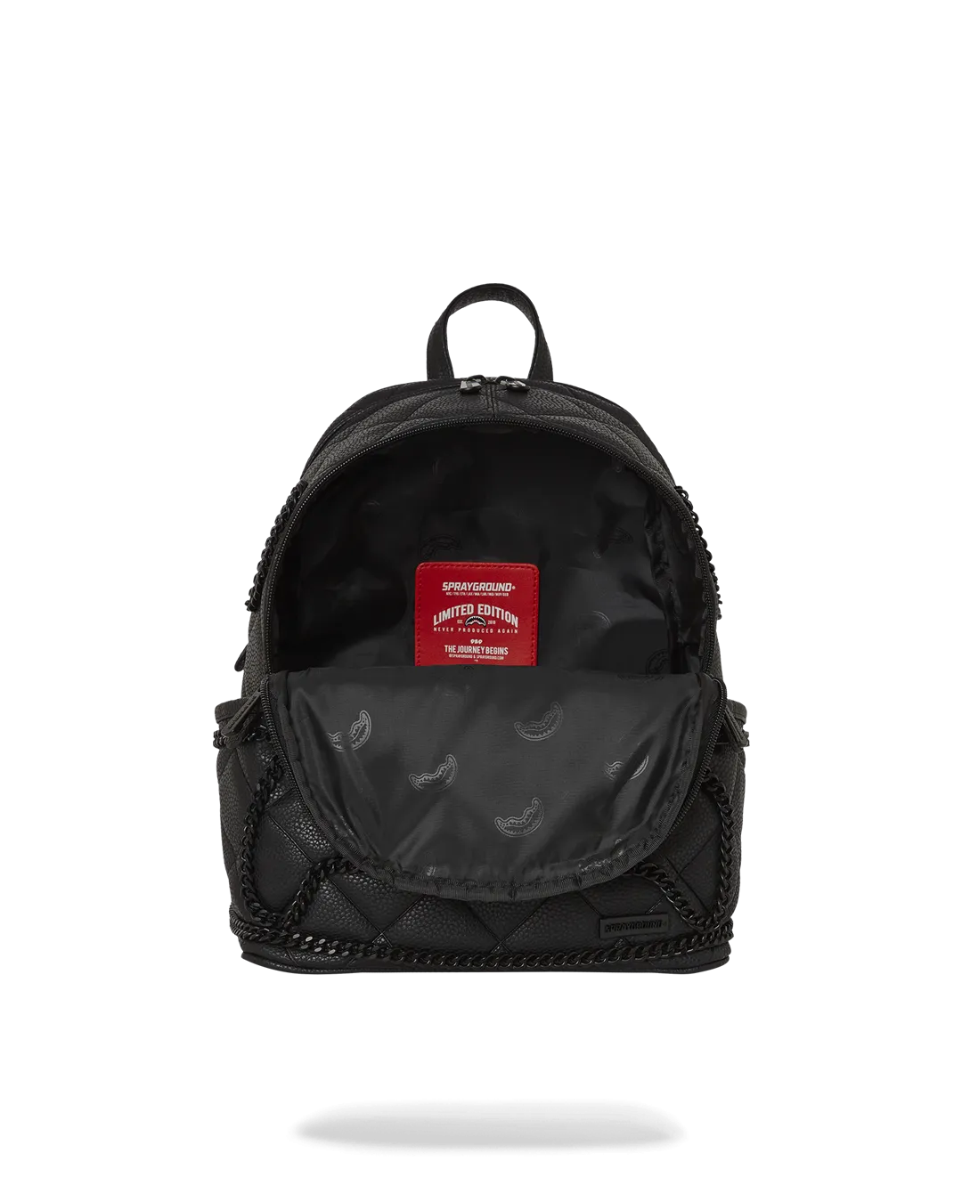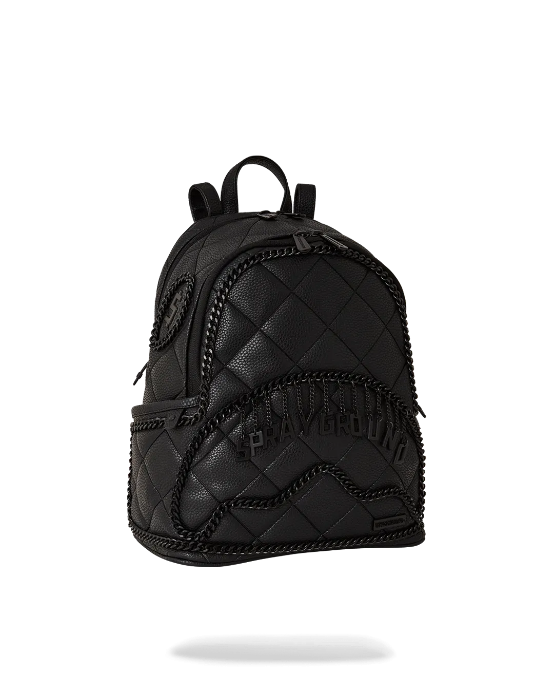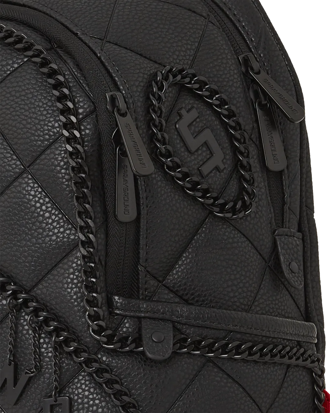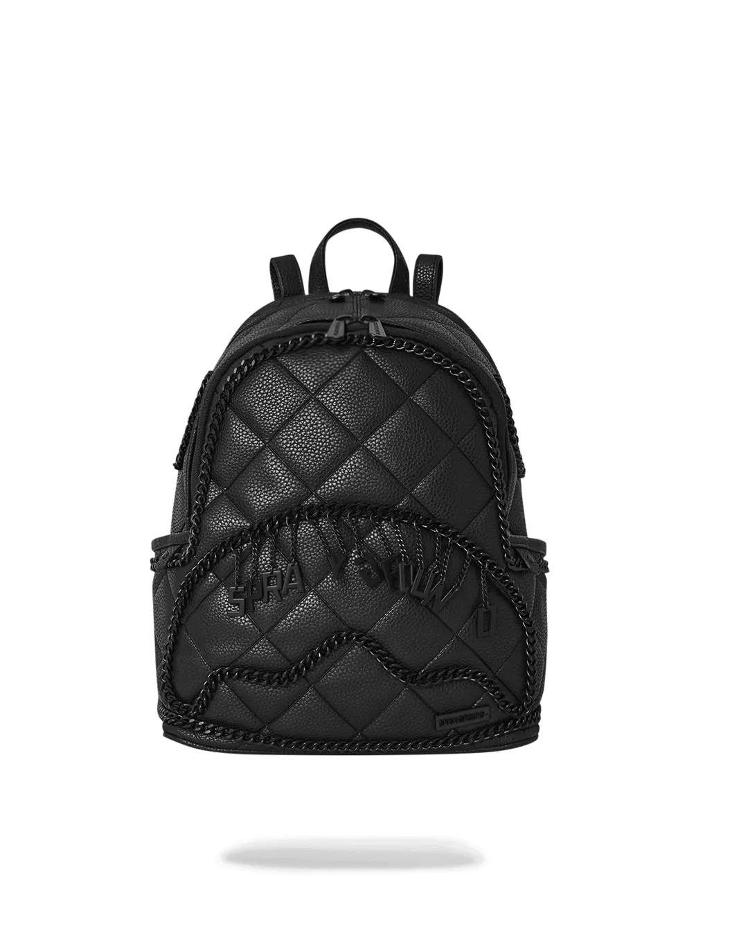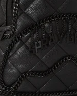 100% PVC quilted black faux leather featuring black chain hardware and hanging charm logo.