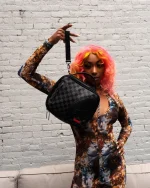 Dimensions: 8.5″ x 3″ x 8.5″ ? Double zipper opening ? Top handle ? Removeable side handle ? Gold zippers with metal hardware ? Zippered stash pocket