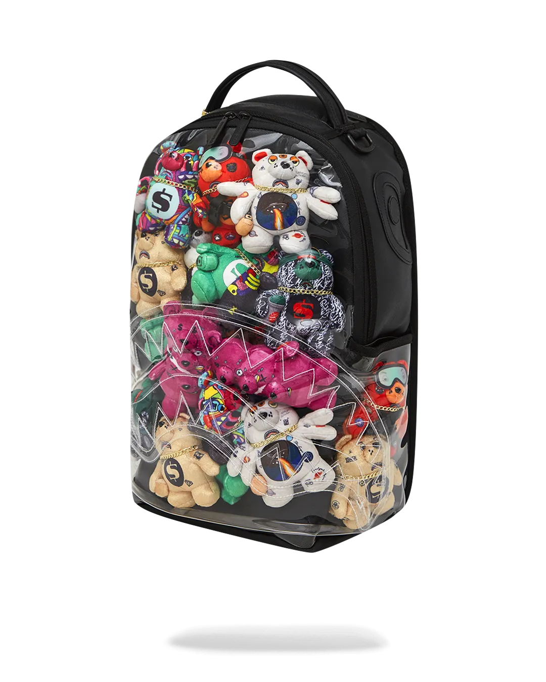 Guess how many mini bears we can fit in a backpack?? Fully functional DLX backpack stuffed with over 18 miniature bears behind a clear PVC cut and sew mouth.