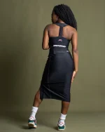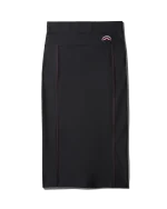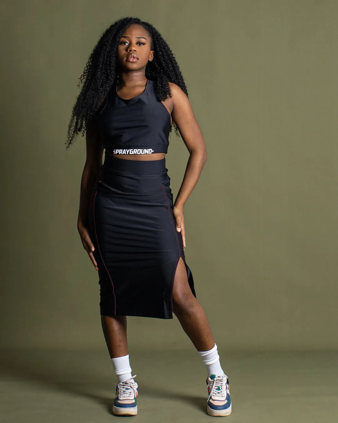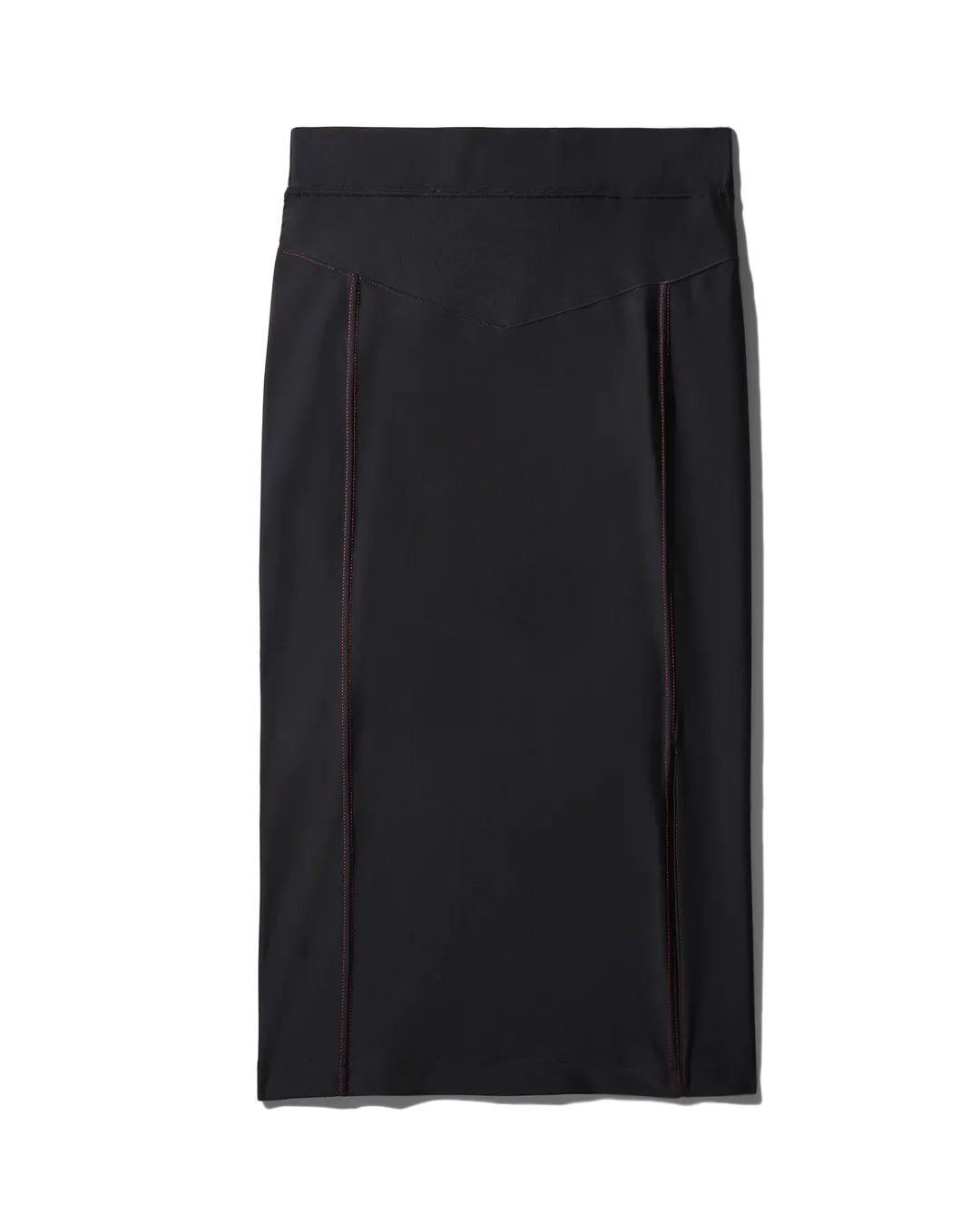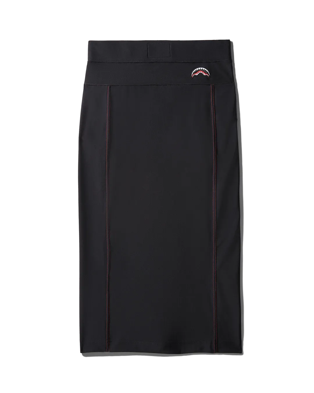 Pull On Athletic Skirt Contrast top stitching and sharkmouth logo embroidery detail on back. Comfortable techy stretch fabric High waist fit with 2″ waist band 30″ length hits at mid-calf on 5’9″ model 10″ comfort slit Size: M 16″ Hip |