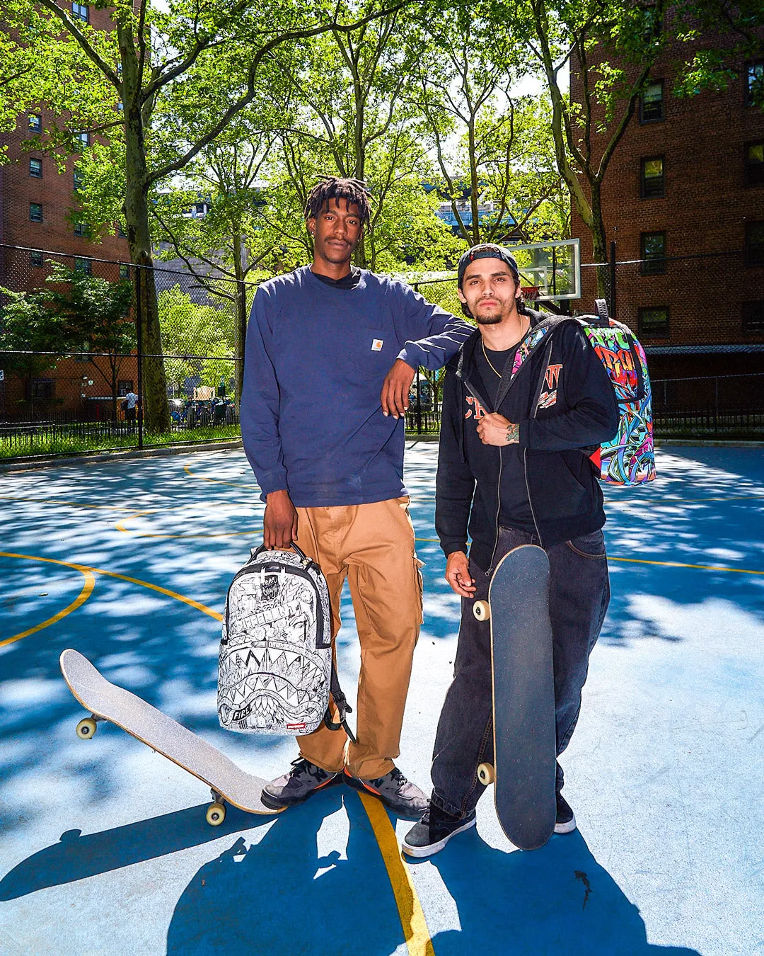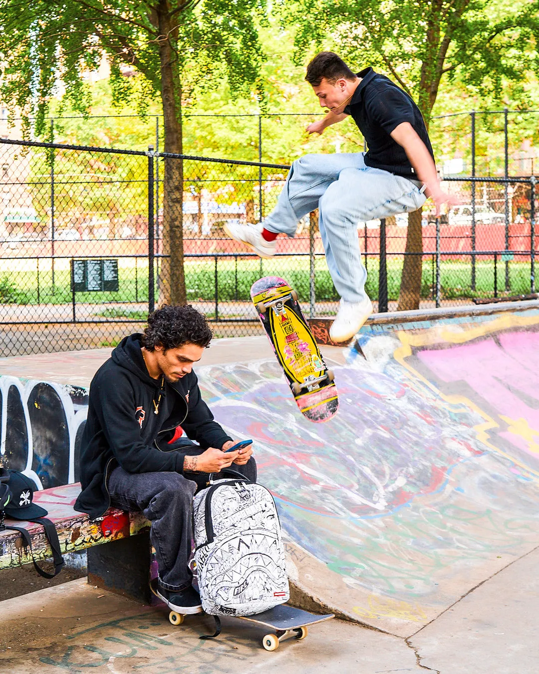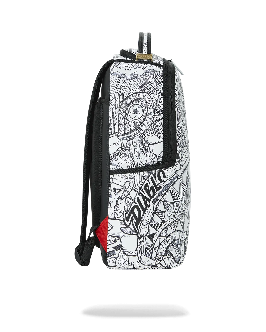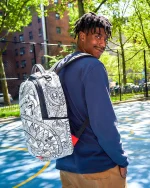 Dimensions: 18″ x 6″ x 11.5″ ? Front zipper pocket ? Side pockets ? Zippered Stash pocket ? Separate velour sunglass compartment ? Ergonomic mesh back padding ? Adjustable Straps for custom sizing ? Gold zippers with metal hardware ? Metal “Sprayground Authentic” badge ? Slide through back sleeve connects to carry-on luggage to free your hands