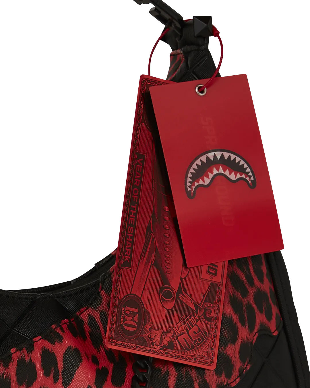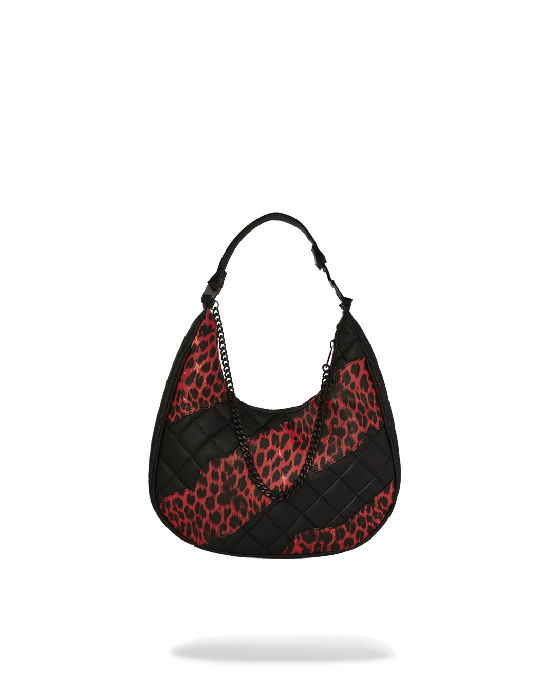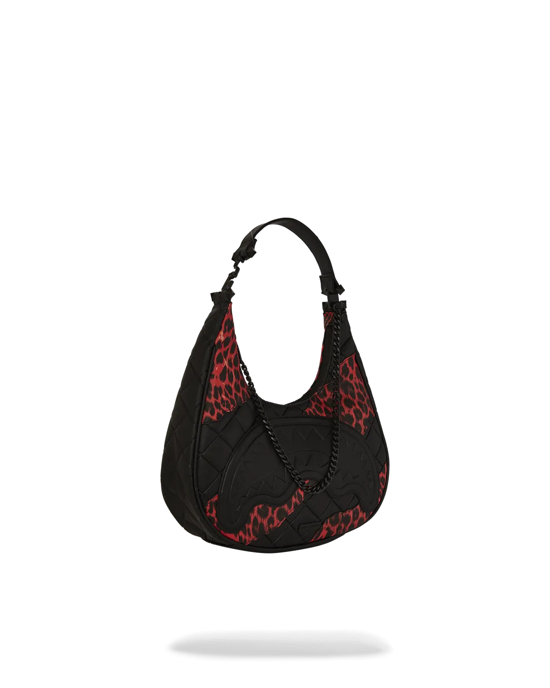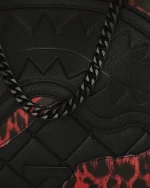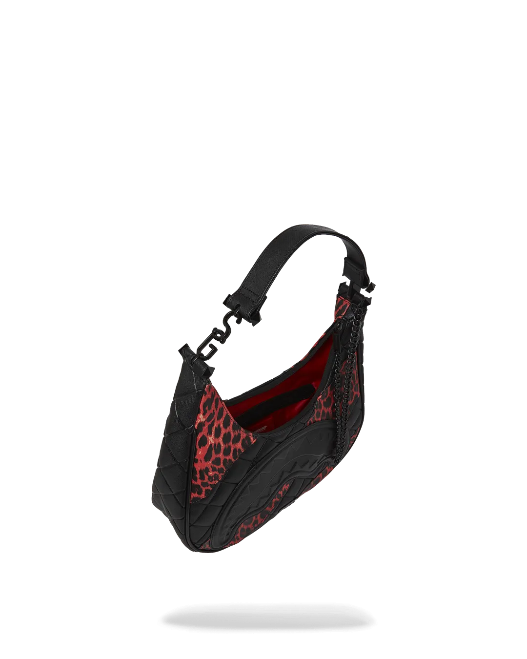 Quilted handbag with cut and sew leopard tear, an embossed sharkmouth, and a chained zipper puller.