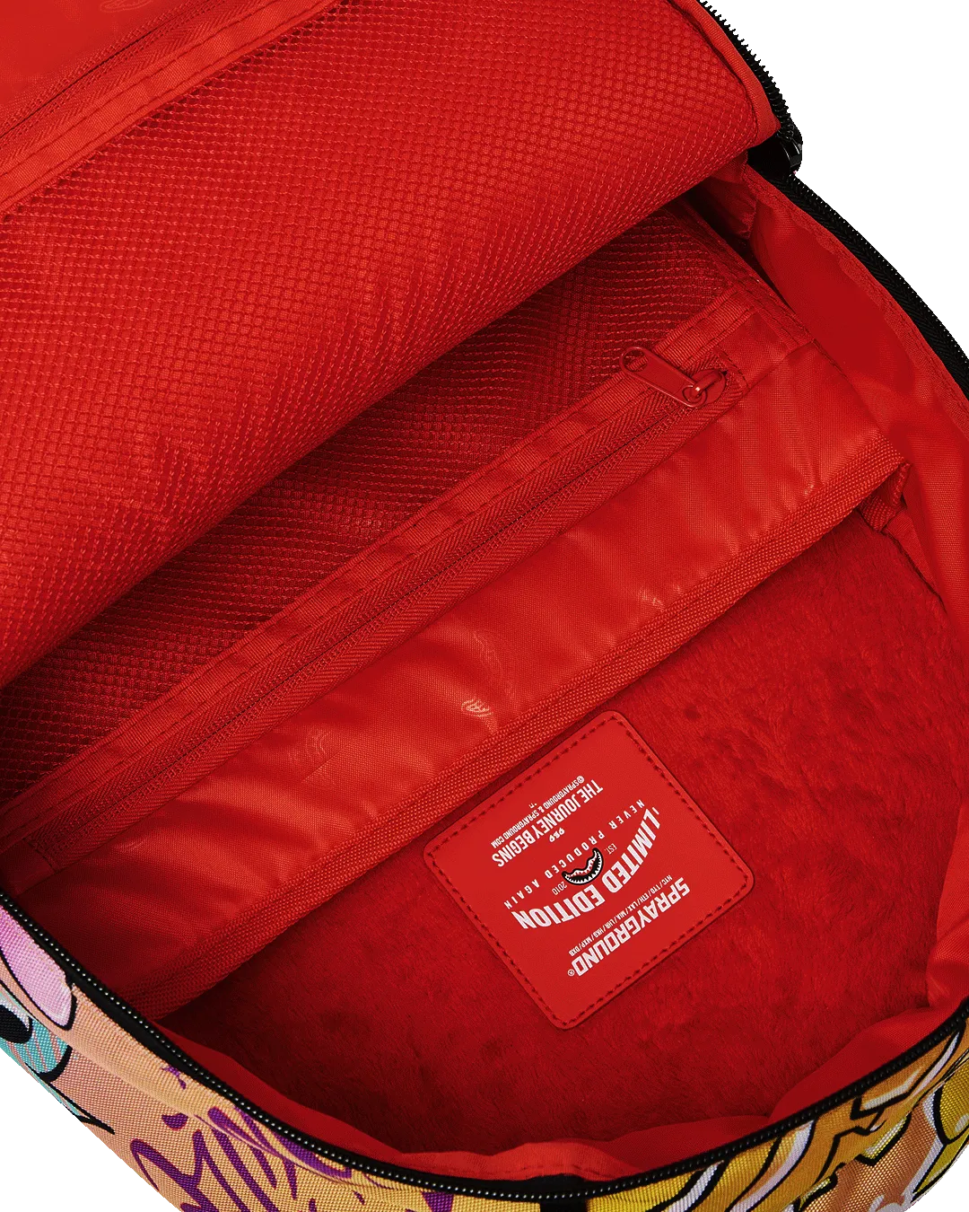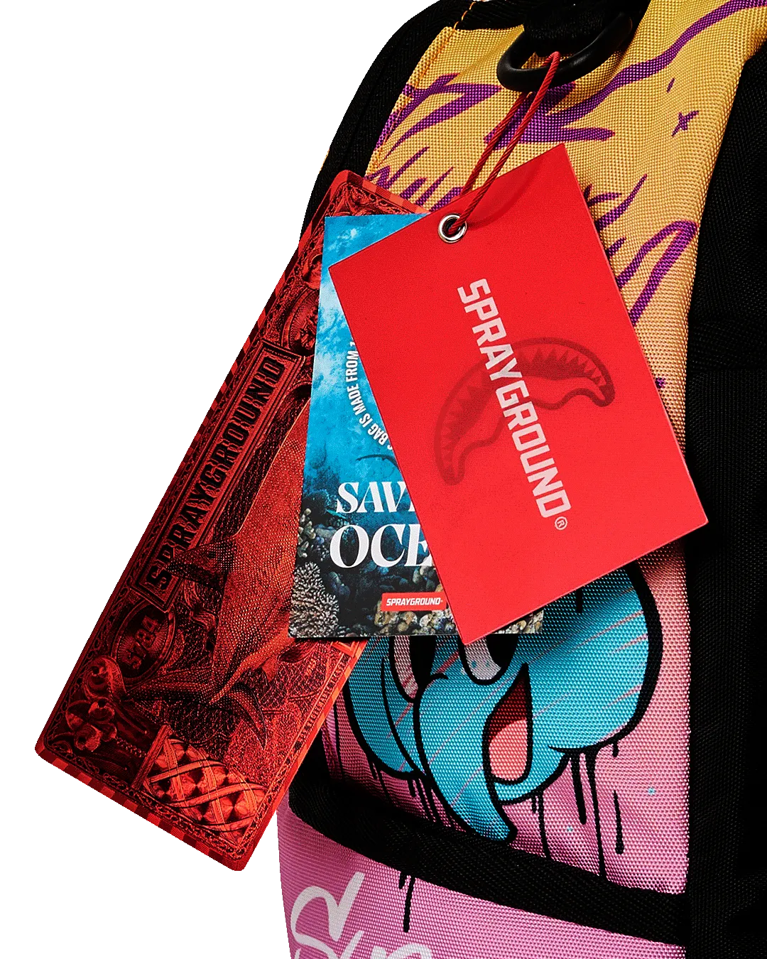 Dimensions: 18″ x 6″ x 11.5″ ? Front zipper pocket ? Side pockets ? Zippered Stash pocket ? Separate velour sunglass compartment ? Ergonomic mesh back padding ? Adjustable Straps for custom sizing ? Gold zippers with metal hardware ? Metal “Sprayground Authentic” badge ? Slide through back sleeve connects to carry-on luggage to free your hands