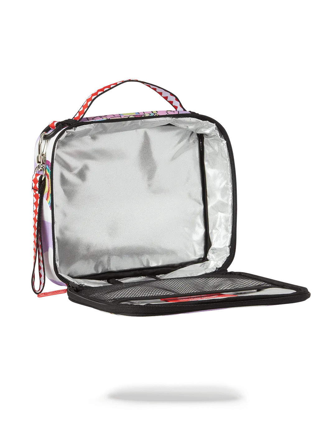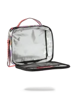 Dimensions: 8.5″ x 3″ x 8.5″ ? Double zipper opening ? Top handle ? Removeable side handle ? Red zippers with metal hardware ? Zippered stash pocket