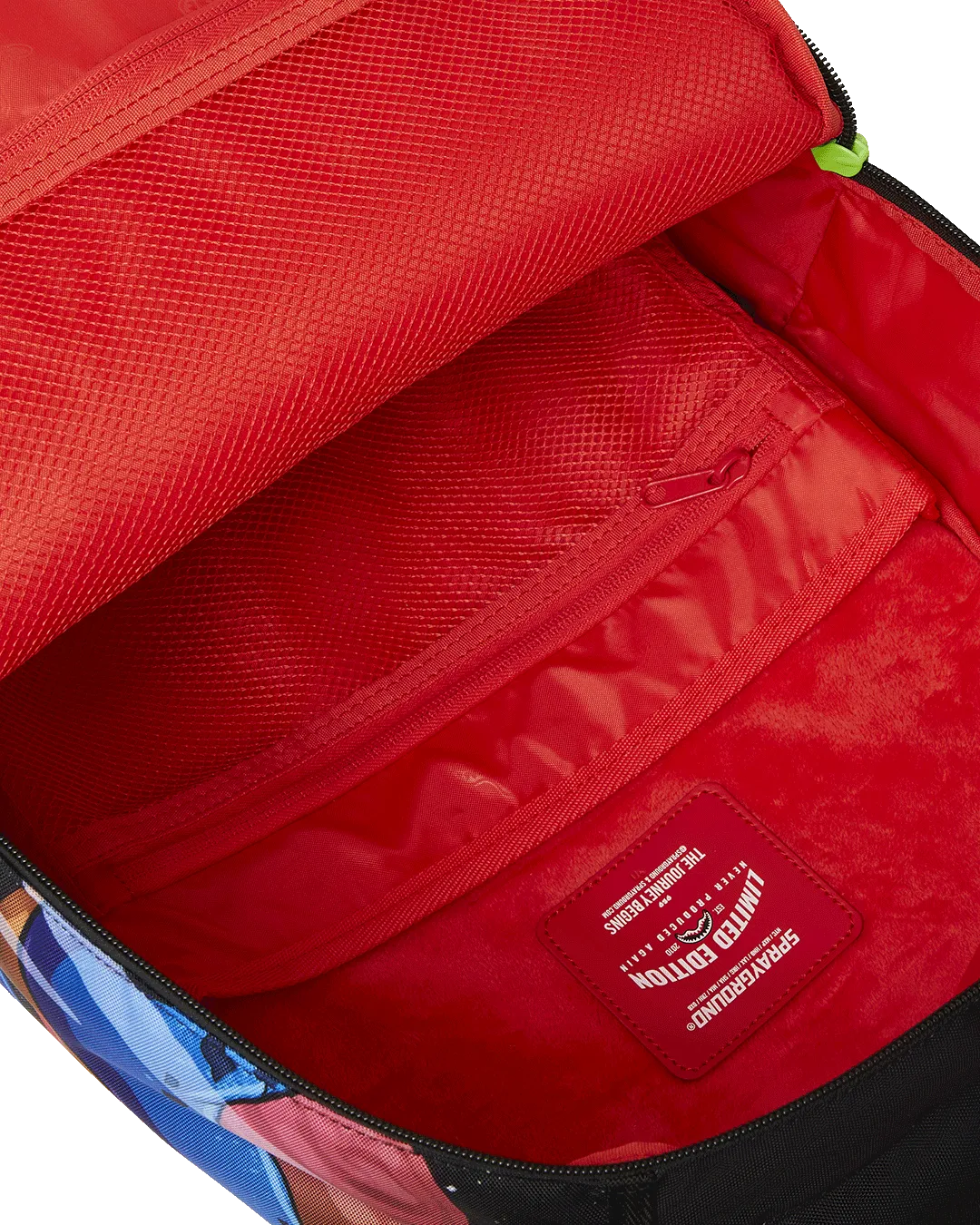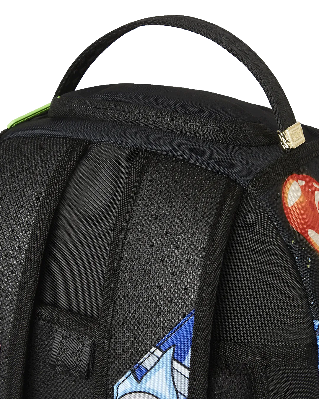 Dimensions: 18″ x 6″ x 11.5″ ? Front zipper pocket ? Side pockets ? Zippered Stash pocket ? Separate velour sunglass compartment ? Ergonomic mesh back padding ? Adjustable Straps for custom sizing ? Gold zippers with metal hardware ? Metal “Sprayground Authentic” badge ? Slide through back sleeve connects to carry-on luggage to free your hands