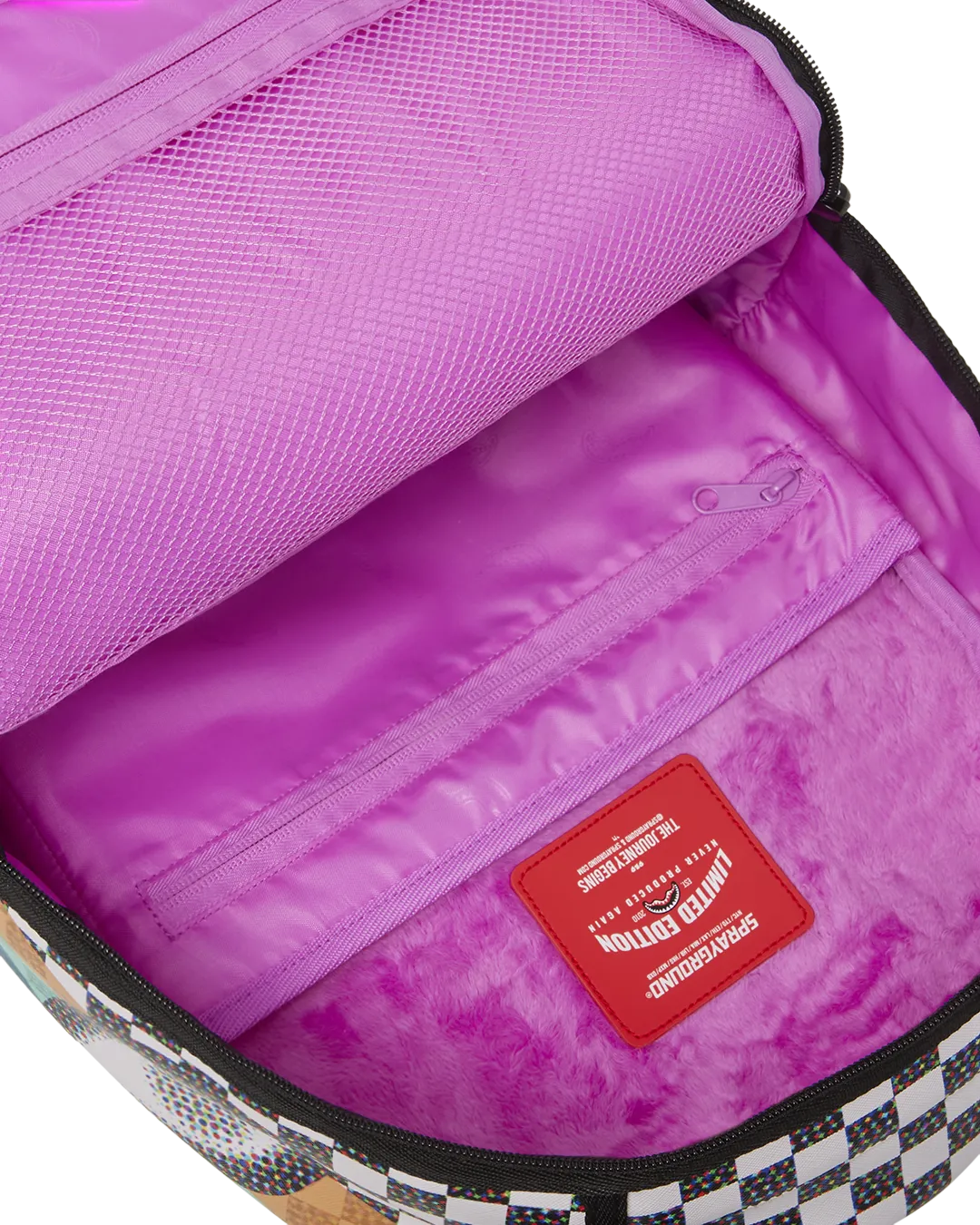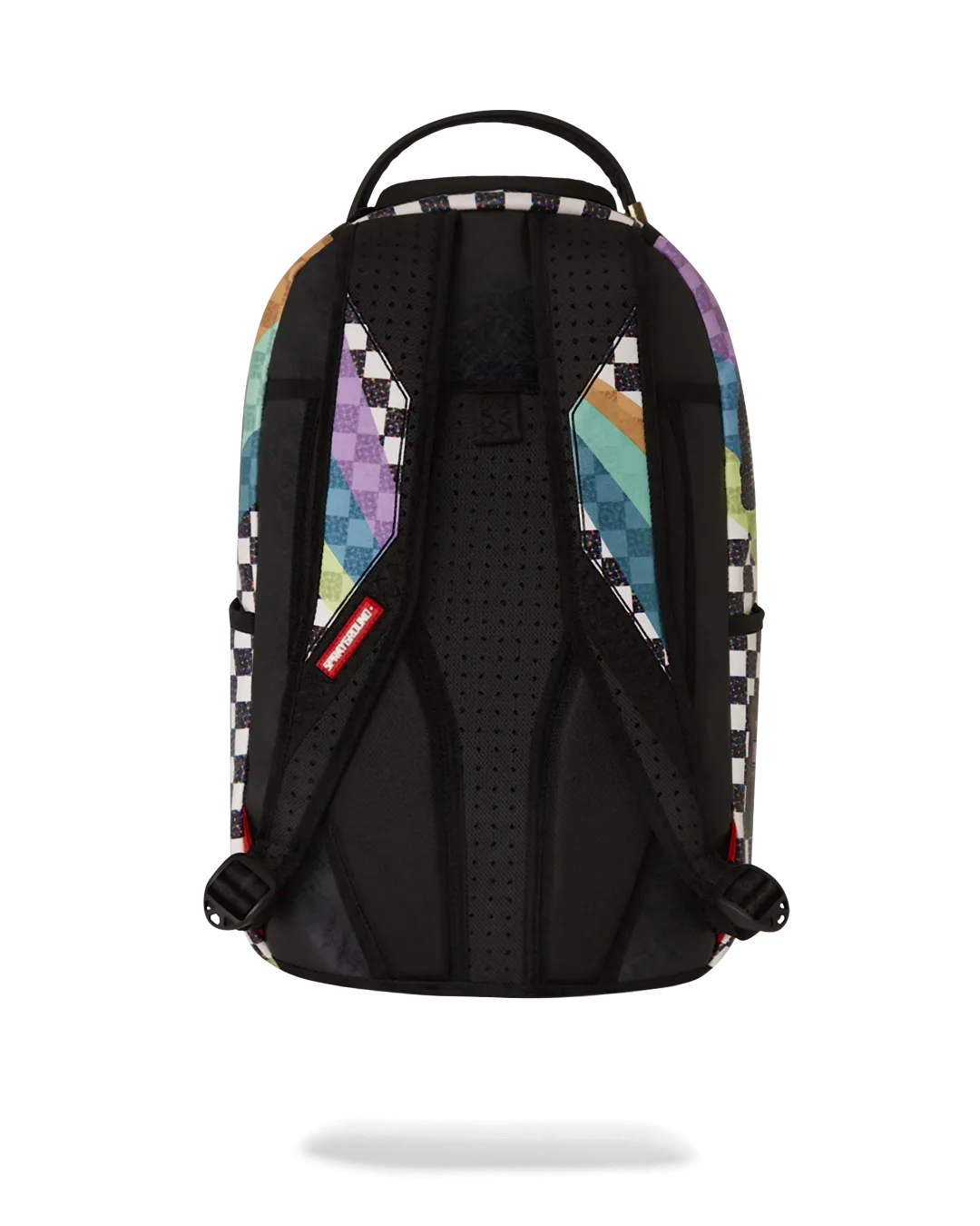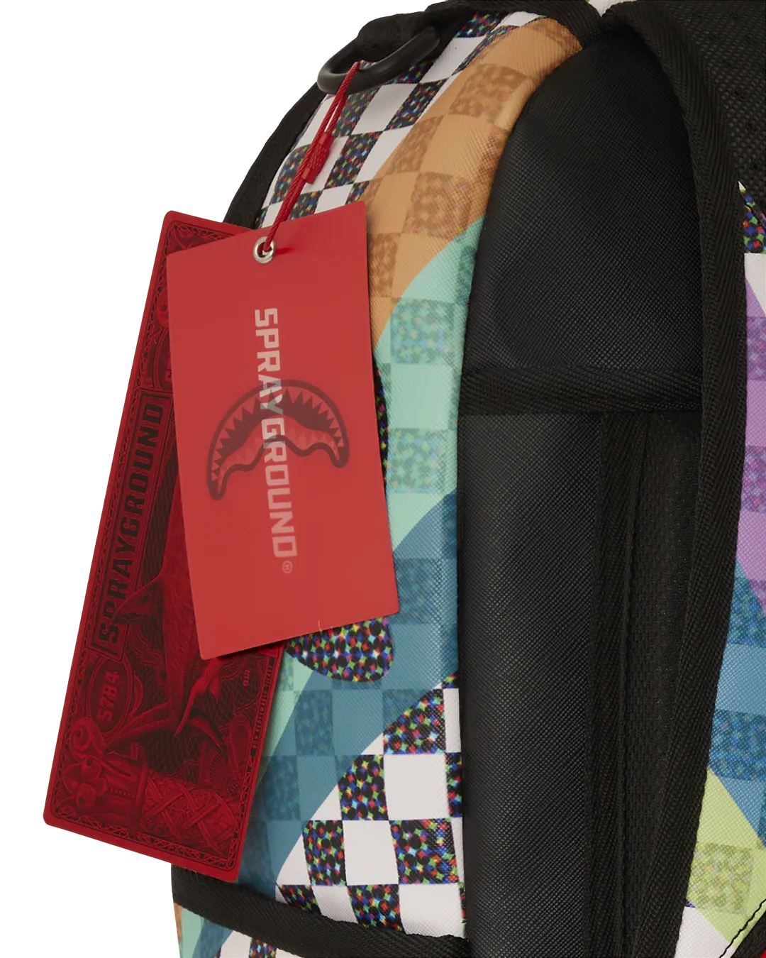 Dimensions: 18″ x 6″ x 11.5″ ? Front zipper pocket ? Side pockets ? Zippered Stash pocket ? Separate velour sunglass compartment ? Ergonomic mesh back padding ? Adjustable Straps for custom sizing ? Gold zippers with metal hardware ? Metal “Sprayground Authentic” badge ? Slide through back sleeve connects to carry-on luggage to free your hands