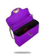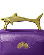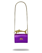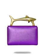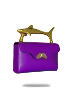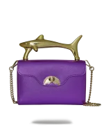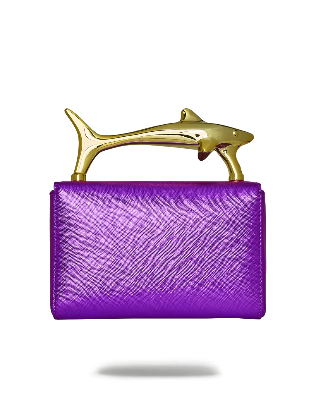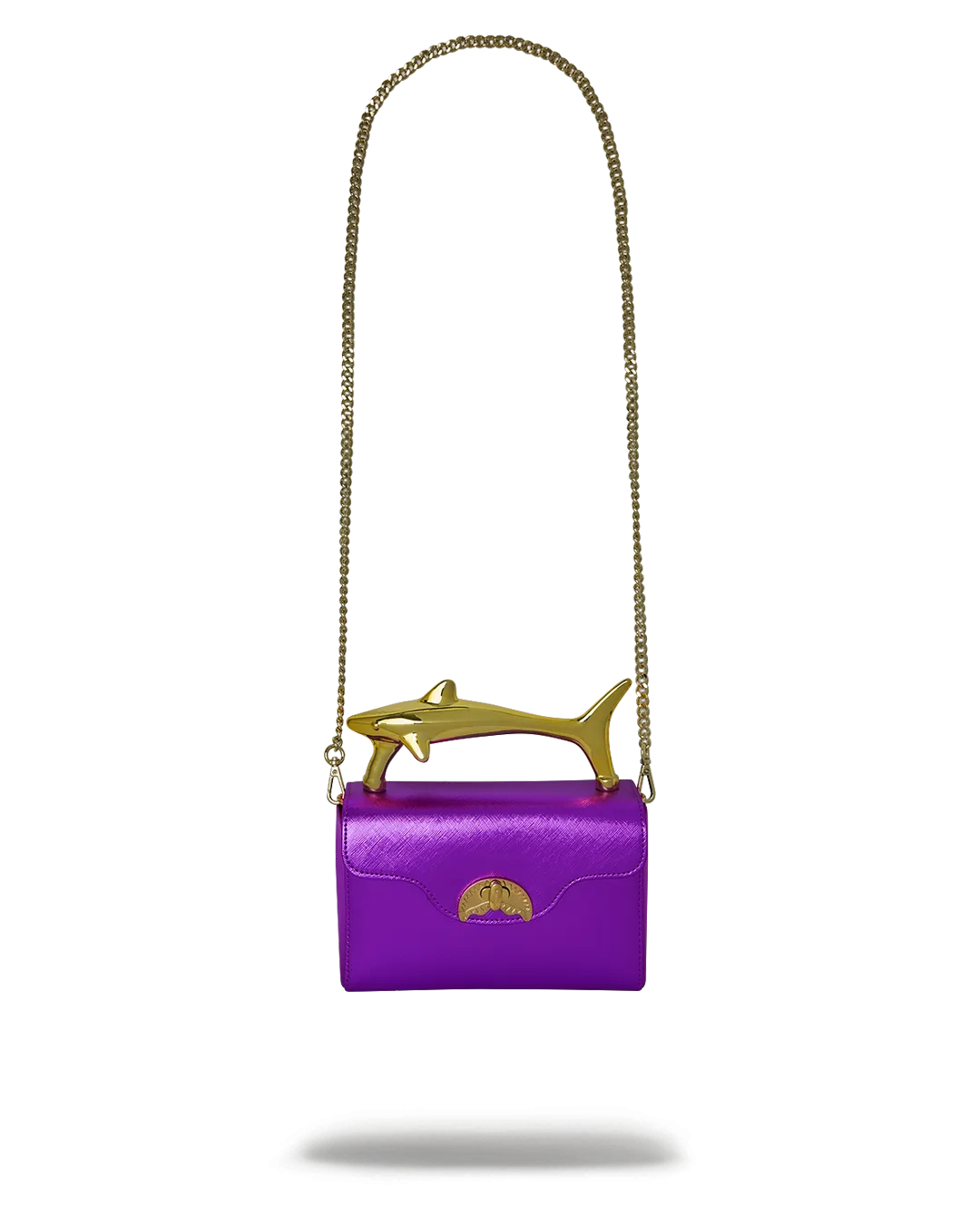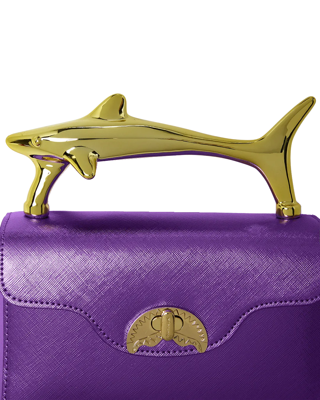Shimmer and shine! Custom shark molded handle clutch with metallic purple fabric. Includes optional chain for crossbody wear and turn lock. Includes one interior pocket. HANDLE WITH CARE!
