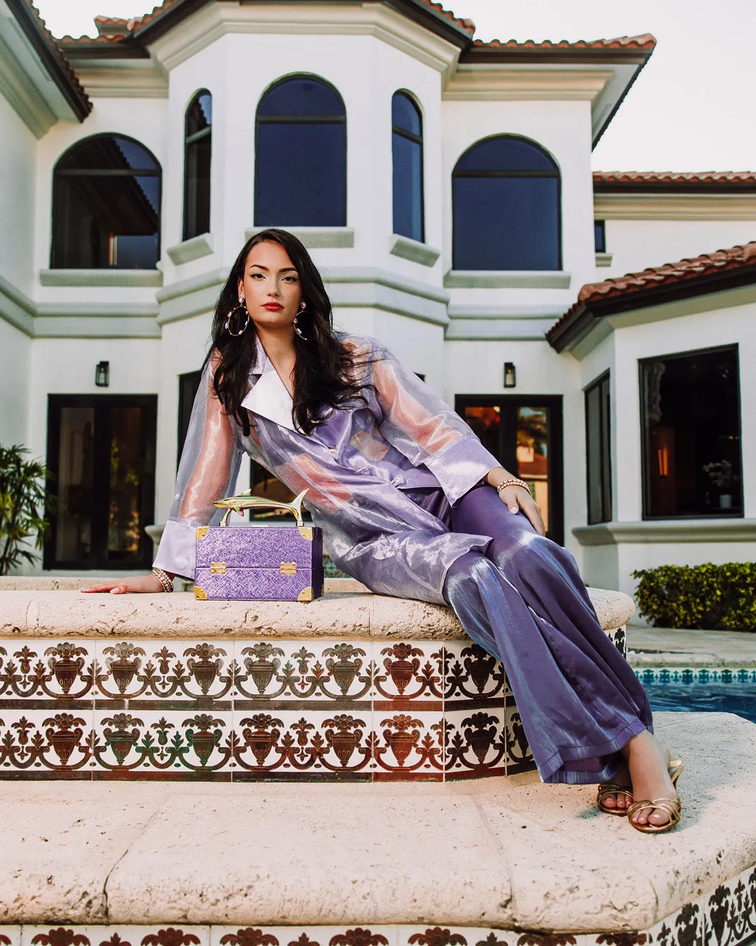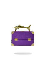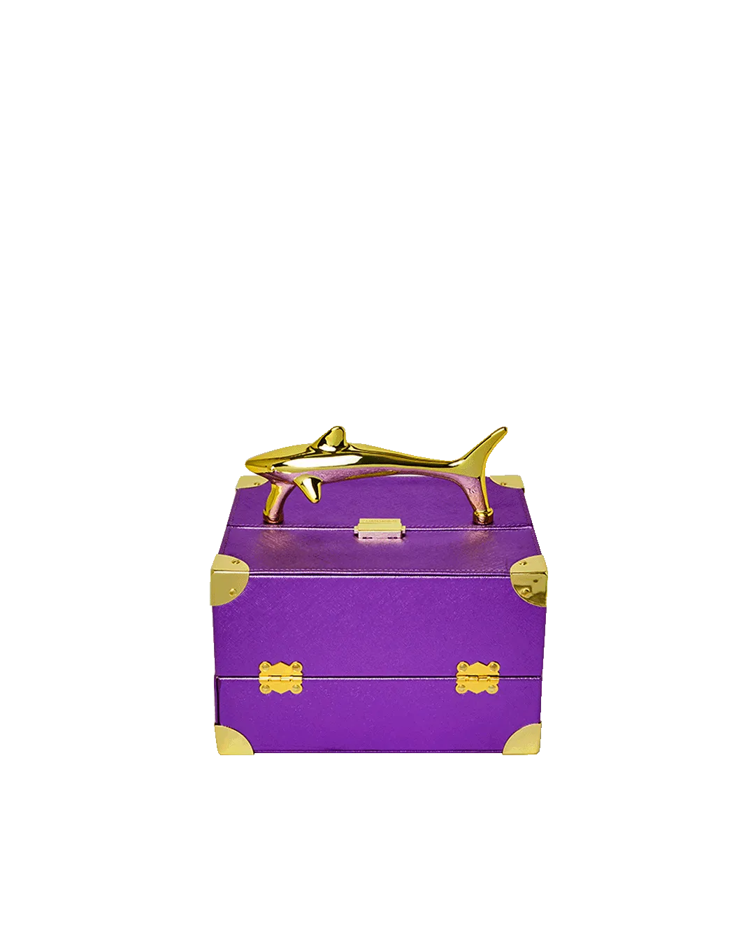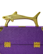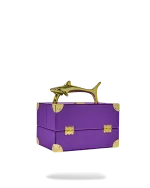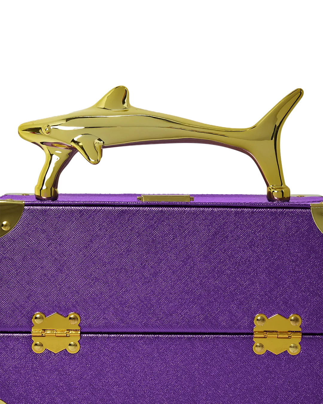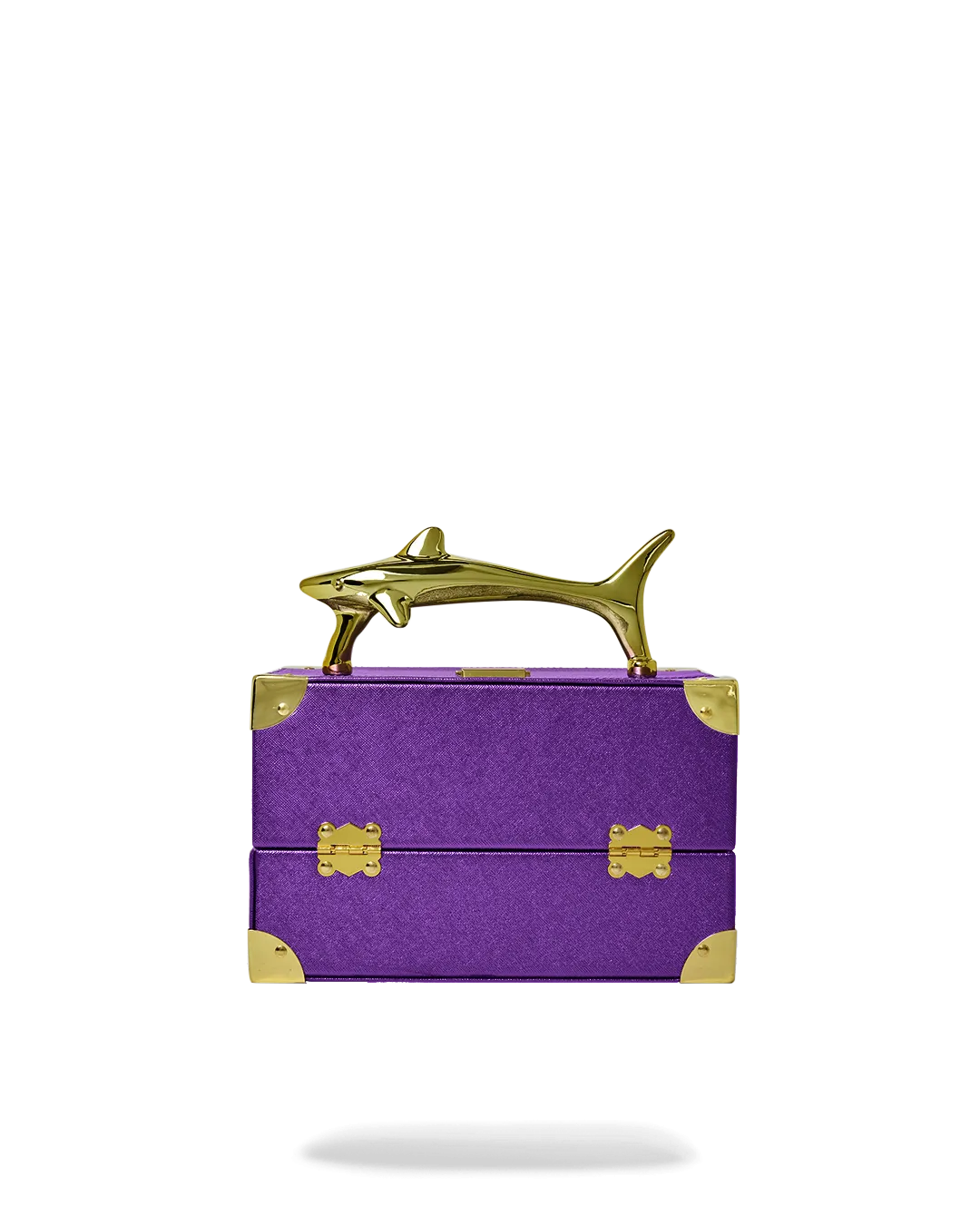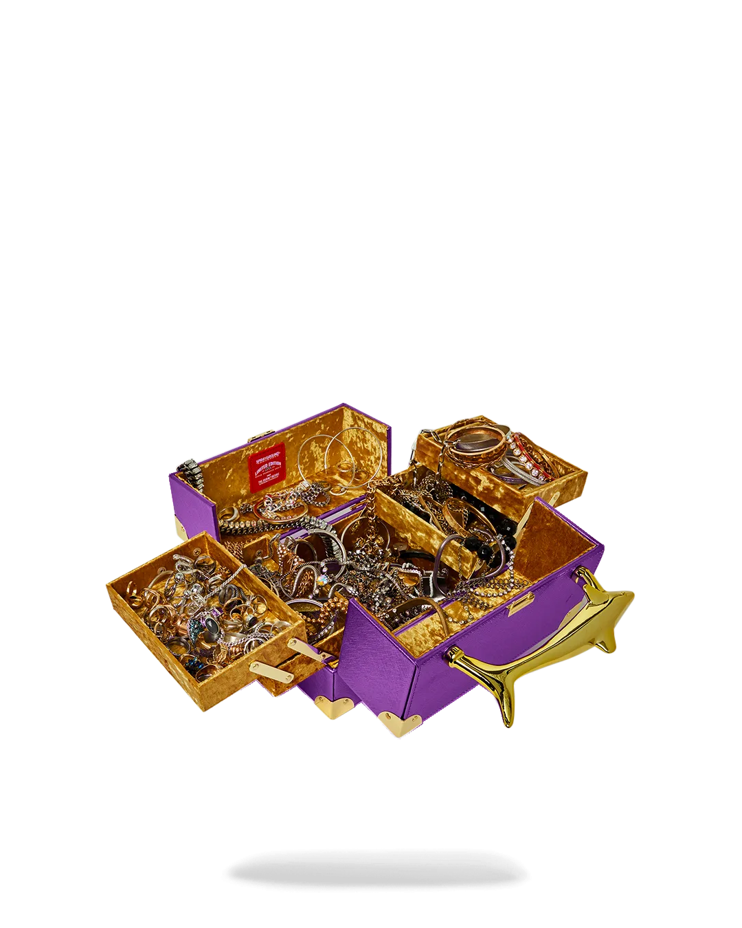 Shimmer and shine! Custom shark molded handle jewelry case with metallic purple fabric and crushed gold velour interior lining