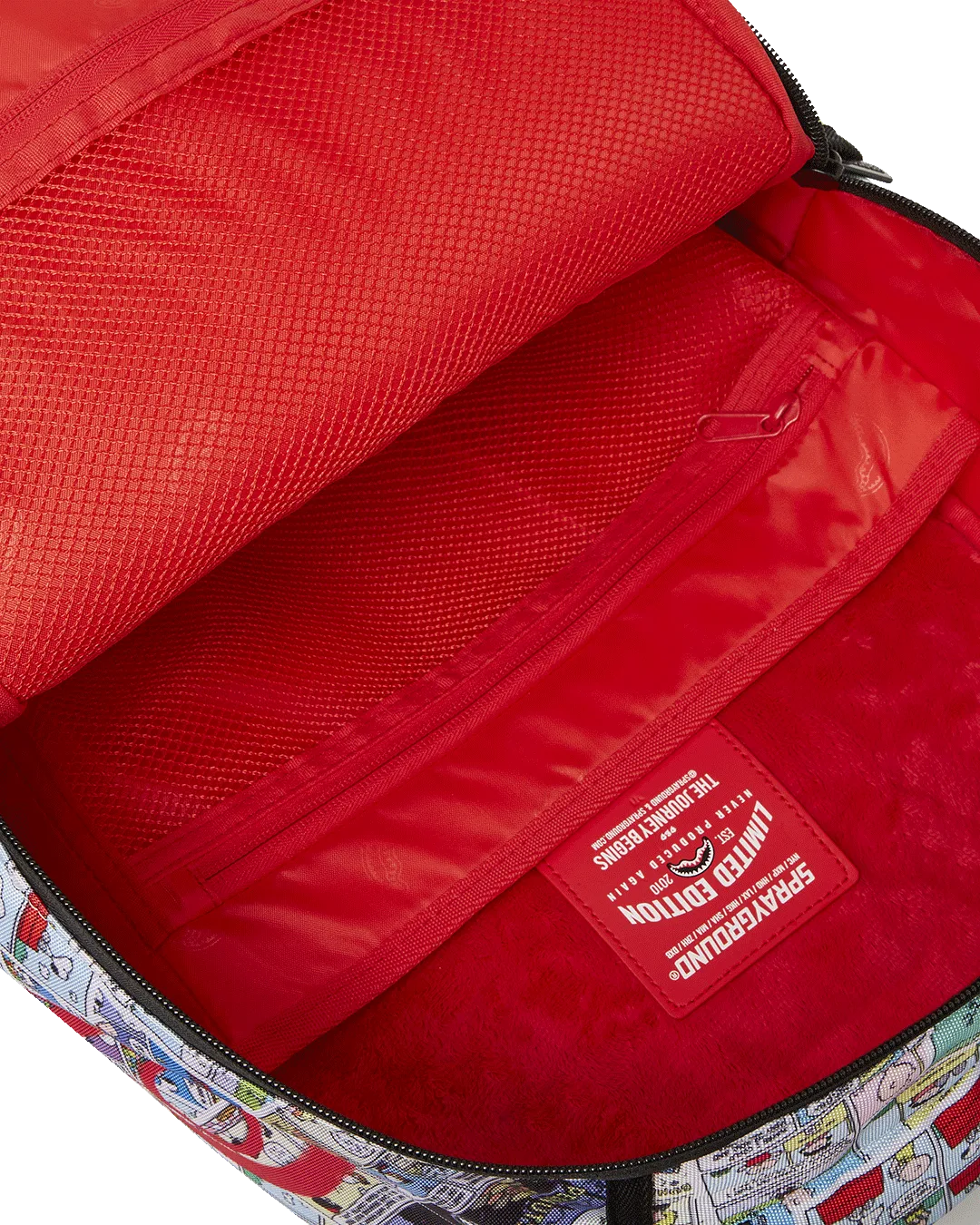 Dimensions: 18″ x 6″ x 11.5″ ? Front zipper pocket ? Side pockets ? Zippered Stash pocket ? Separate velour sunglass compartment ? Ergonomic mesh back padding ? Adjustable Straps for custom sizing ? Gold zippers with metal hardware ? Metal “Sprayground Authentic” badge ? Slide through back sleeve connects to carry-on luggage to free your hands