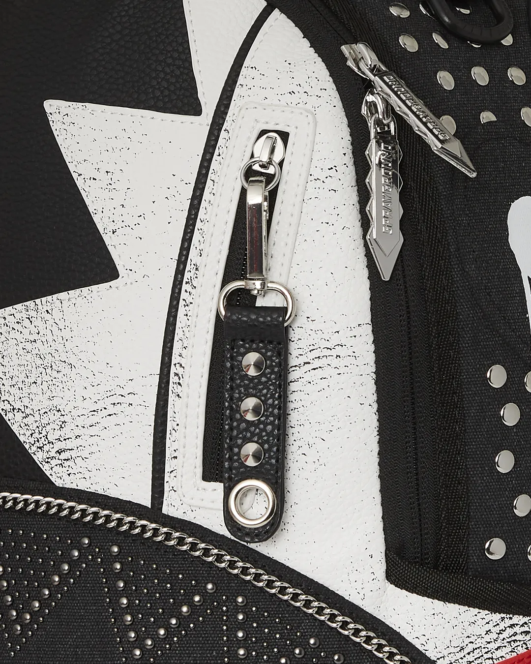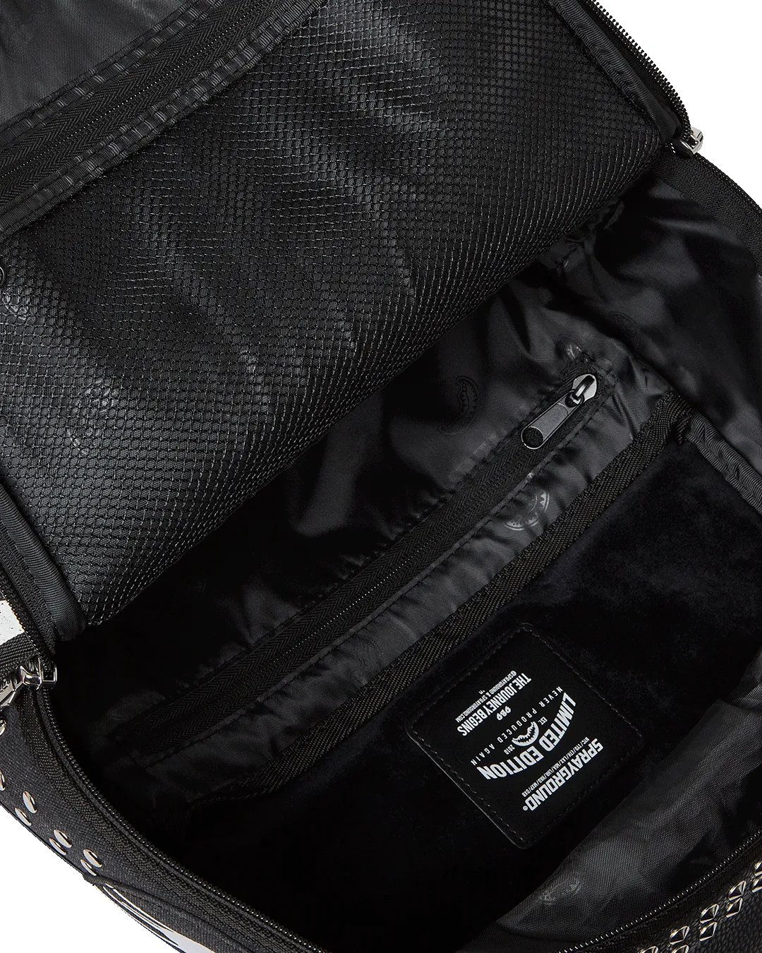 Dimensions: 18″ x 6″ x 11.5″ ? Front zipper pocket ? Side pockets ? Zippered Stash pocket ? Separate velour sunglass compartment ? Ergonomic mesh back padding ? Adjustable Straps for custom sizing ? Gold zippers with metal hardware ? Metal “Sprayground Authentic” badge ? Slide through back sleeve connects to carry-on luggage to free your hands