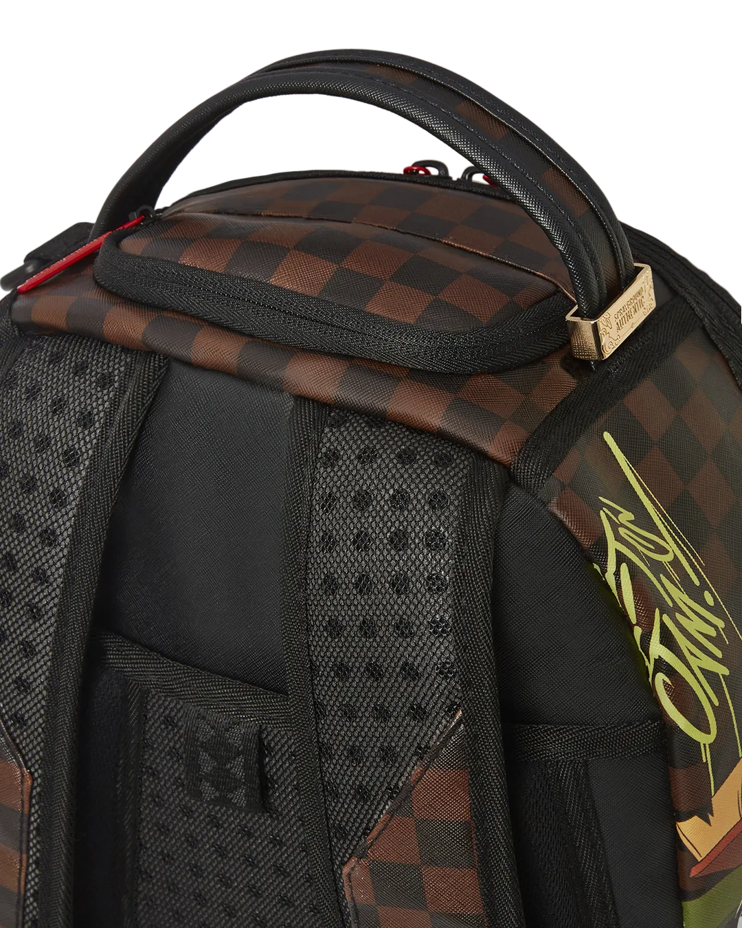 Dimensions: 18″ x 6″ x 11.5″ ? Front zipper pocket ? Side pockets ? Zippered Stash pocket ? Separate velour sunglass compartment ? Ergonomic mesh back padding ? Adjustable Straps for custom sizing ? Red zippers with metal hardware ? Metal “Sprayground Authentic” badge ? Slide through back sleeve connects to carry-on luggage to free your hands