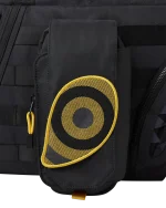 Fabric made from polyester satin weave with monochromatic camo details and contrast yellow trims