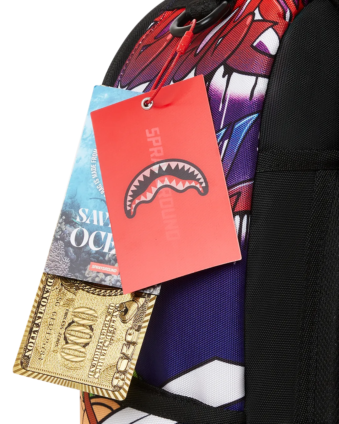 Dimensions: 18″ x 6″ x 11.5″ ? Front zipper pocket ? Side pockets ? Zippered Stash pocket ? Separate velour sunglass compartment ? Ergonomic mesh back padding ? Adjustable Straps for custom sizing ? Gold zippers with metal hardware ? Metal “Sprayground Authentic” badge ? Slide through back sleeve connects to carry-on luggage to free your hands