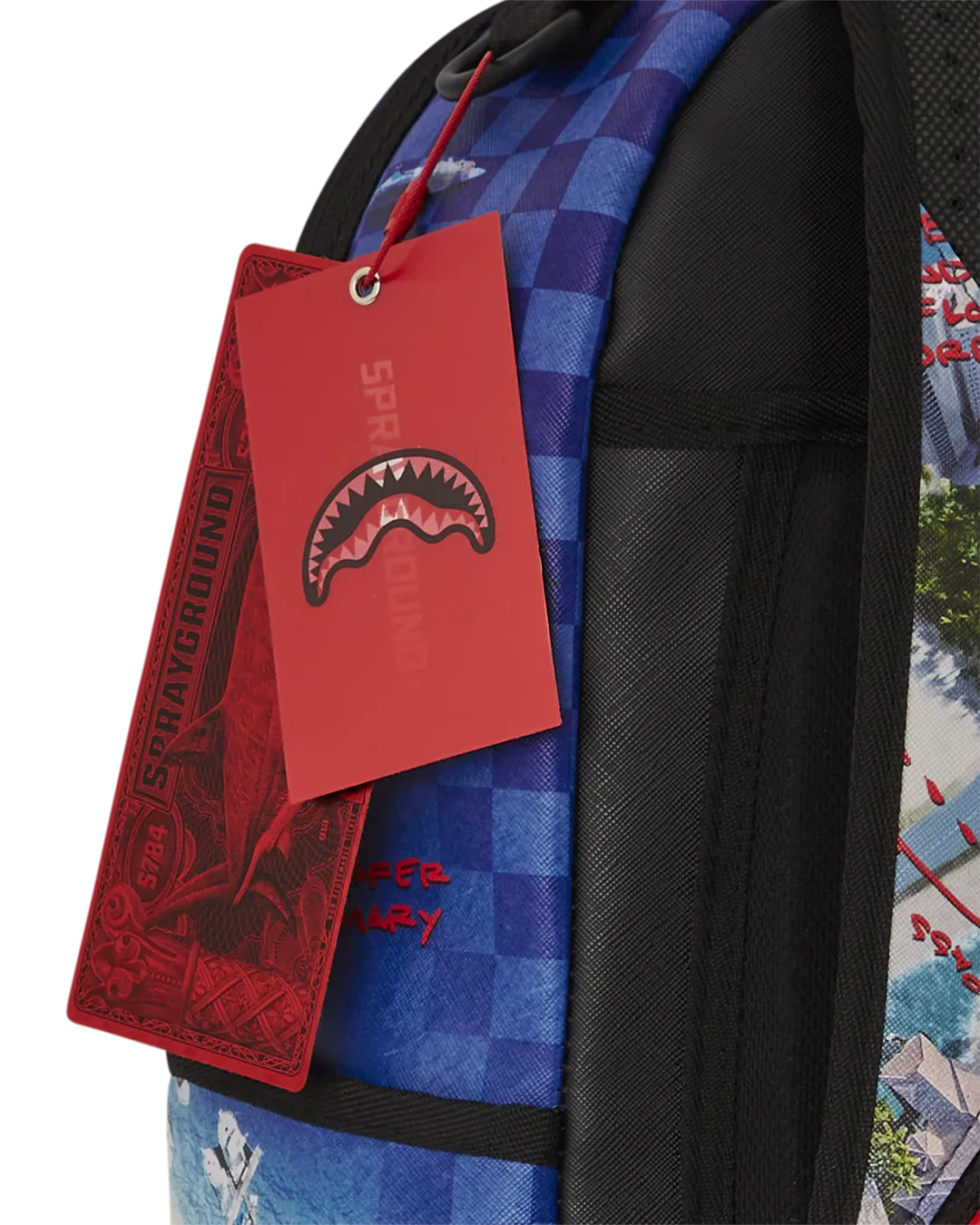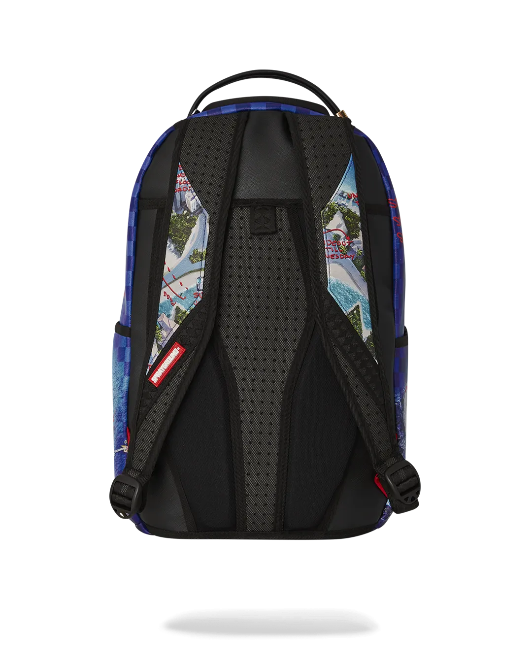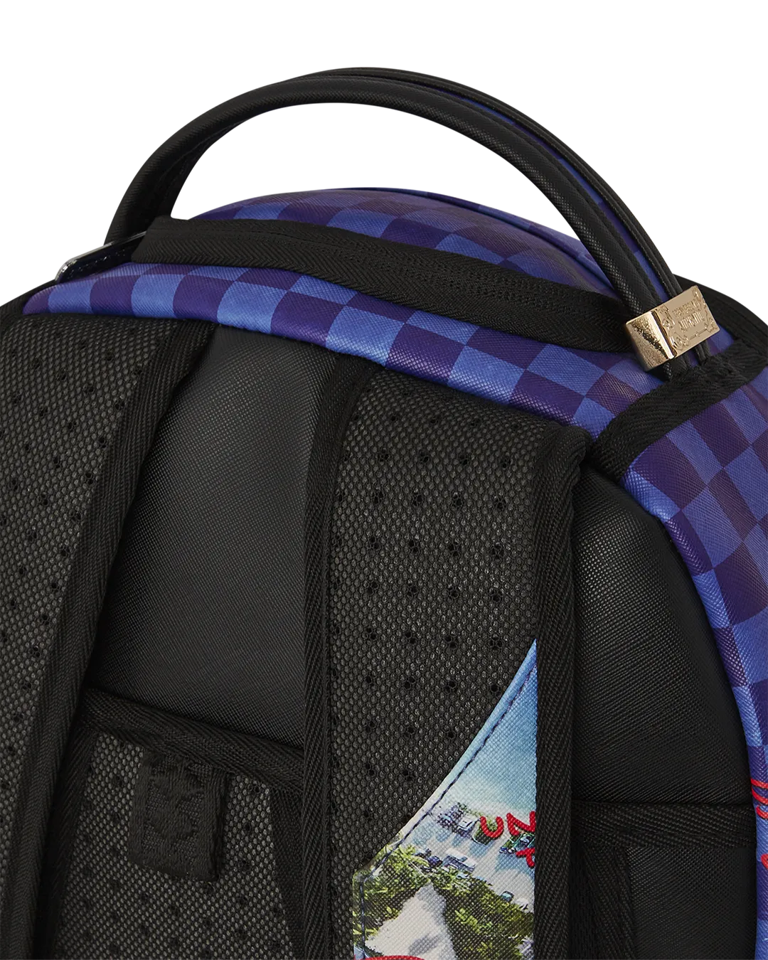 Dimensions: 18″ x 6″ x 11.5″ ? Front zipper pocket ? Side pockets ? Zippered Stash pocket ? Separate velour sunglass compartment ? Ergonomic mesh back padding ? Adjustable Straps for custom sizing ? Gold zippers with metal hardware ? Metal “Sprayground Authentic” badge ? Slide through back sleeve connects to carry-on luggage to free your hands
