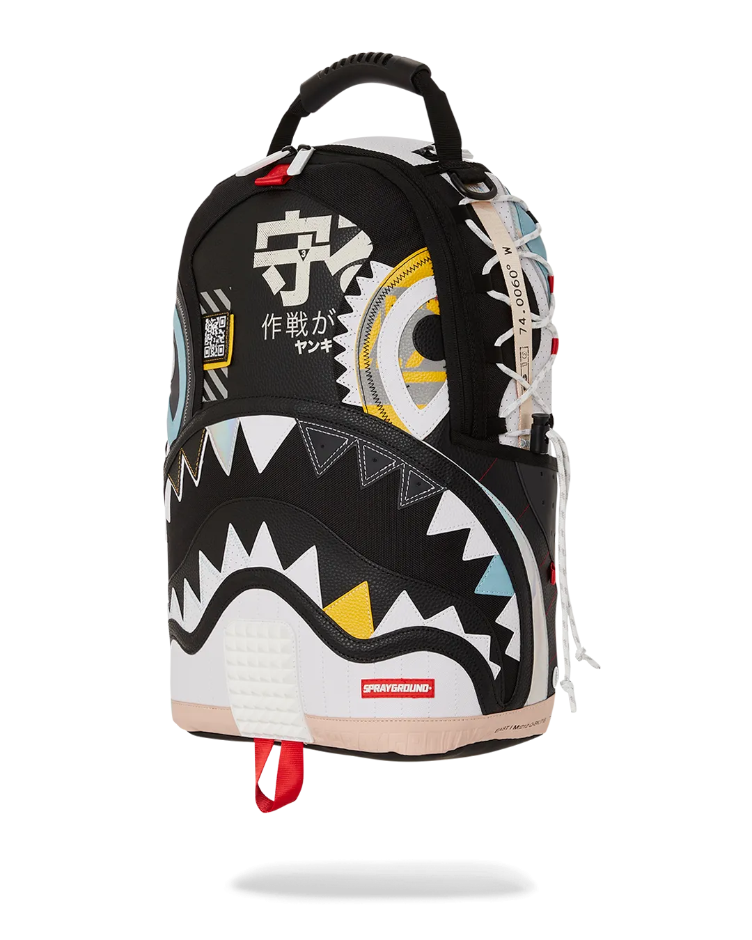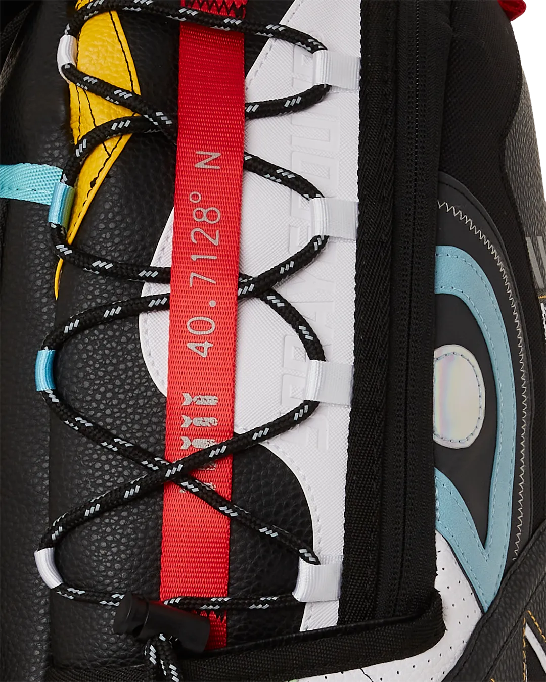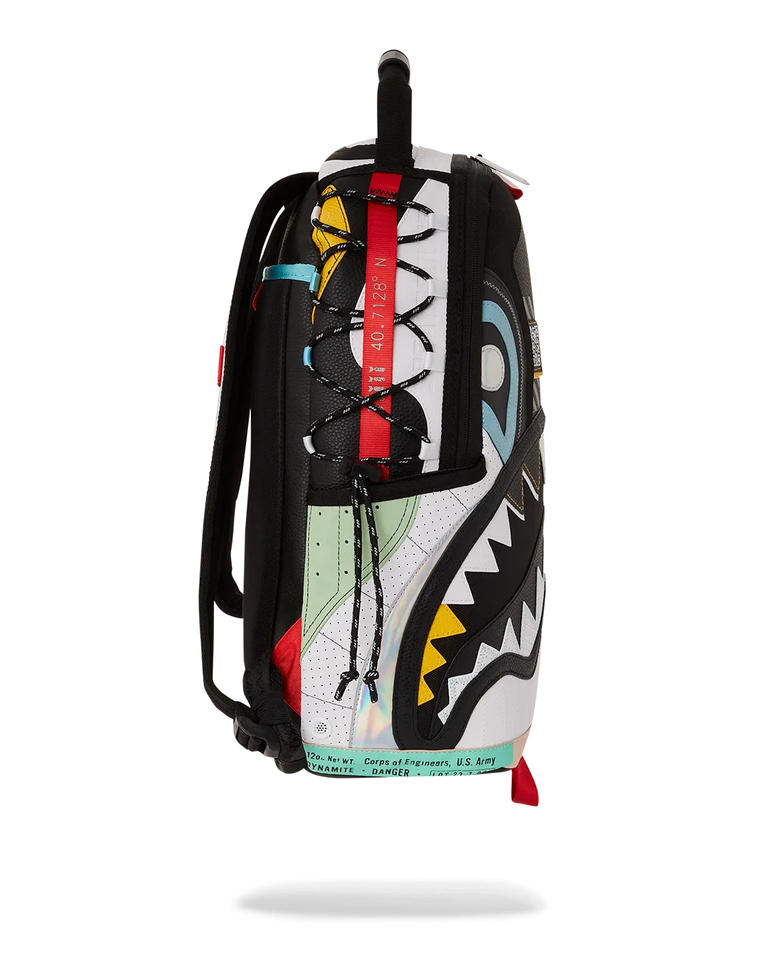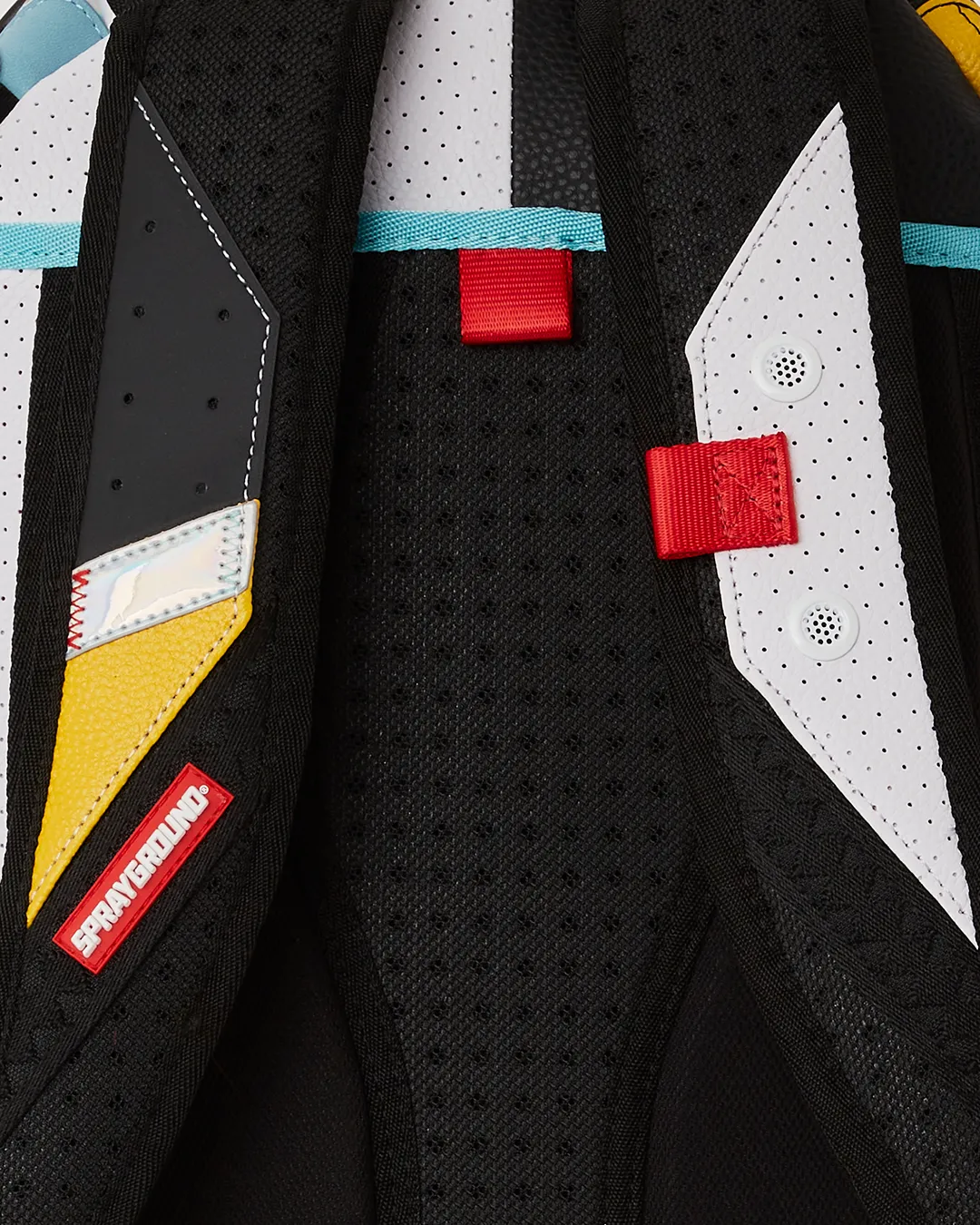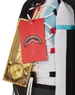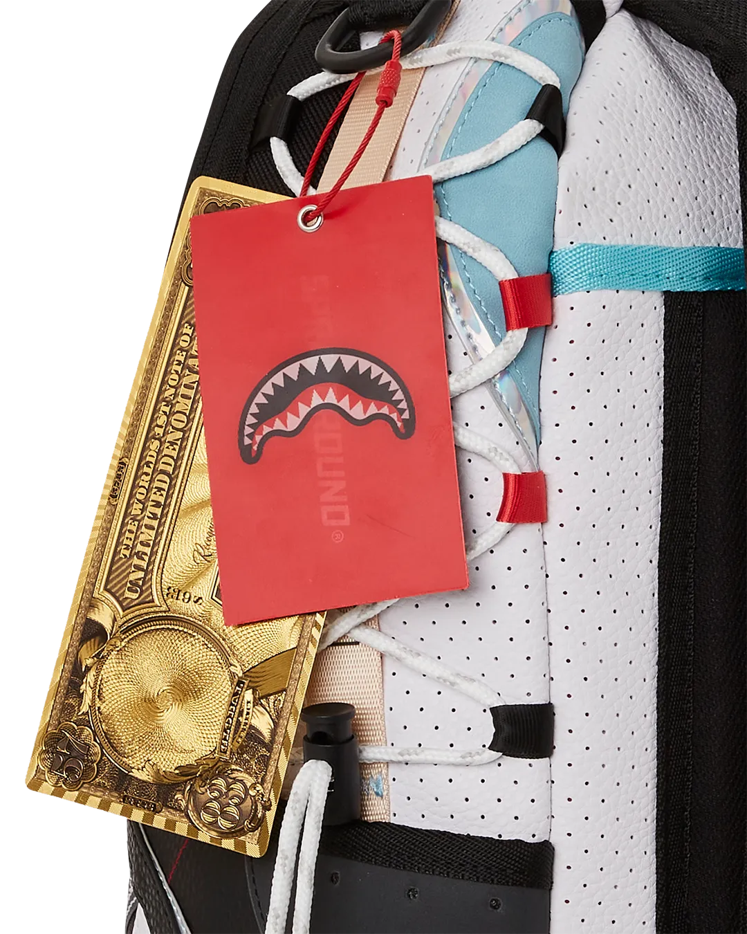 Dimensions: 18″ x 6″ x 11.5″ ? Front zipper pocket ? Side pockets ? Zippered Stash pocket ? Separate velour sunglass compartment ? Ergonomic mesh back padding ? Adjustable Straps for custom sizing ? Gold zippers with metal hardware ? Metal “Sprayground Authentic” badge ? Slide through back sleeve connects to carry-on luggage to free your hands